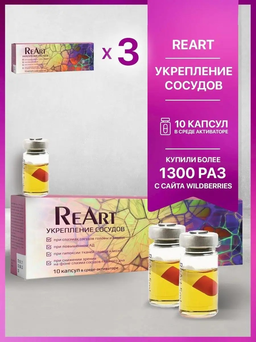Комплекс пищевой на основе растительного сырья ReArt при спазмах сосудов головы и сердца, при повышенном артериальном давлении, при гипоксии тканей сердца и мозга, при снижении зрения на фоне спазма сосудов глазного дна. Биогенная формула содержит источники омега-3 и омега-6 жирных кислот, сквалена, микро- и макро-элементы, которые в комплексе с биологически активными компонентами в составе капсул оказывают дополнительное действие на функции и состояние иммунной, нервной, мочеполовой, эндокринной систем. Форма выпуска 10 ампул, каждая ампула содержит 1 капсулу 500 мг в 5 мл среды-активатора. Способ примененияВскрыть флакон, содержимое флакона (жидкость вместе с капсулой) принимать одновременно за 1 раз на голодный желудок за 30 мин до еды, запивая 100 мл тёплой воды.Курс 30 дней. Рекомендуется 4 курса в год.