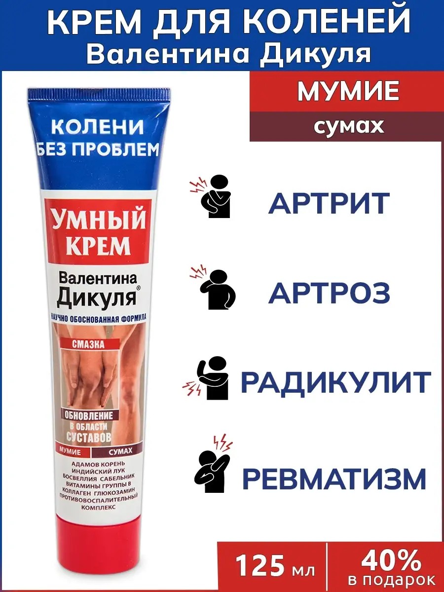 Крем для тела В.Дикуль Умный крем (мумие,сумах)- натуральное средство нового поколения, оказывающее избирательное направленное действие с учетом индивидуального характера функциональных нарушений. Умная формула крема позволяет выявить главный источник проблемы и решать ее комплексно, воздействуя непосредственно на ее причины. Свойства компонентов: Мумиё стимулирует восстановительные процессы в суставах и пролиферацию клеток соединительных тканей, обладает против отёчным, противовоспалительным, антитоксическим, иммуностимулирующим, общеукрепляющим действием. Сумах- содержит вещество токсикодендрол, которое и определяет его лечебные свойства. Проявляет очень высокую эффективность в гомеопатических концентрациях при воспалении суставов после простуды и промокания, при суставном ревматизме, утренней скованности подвижности в суставах, мышечных болях (миалгии), характерном онемении конечностей, повышенной чувствительности к холоду и непогоде.