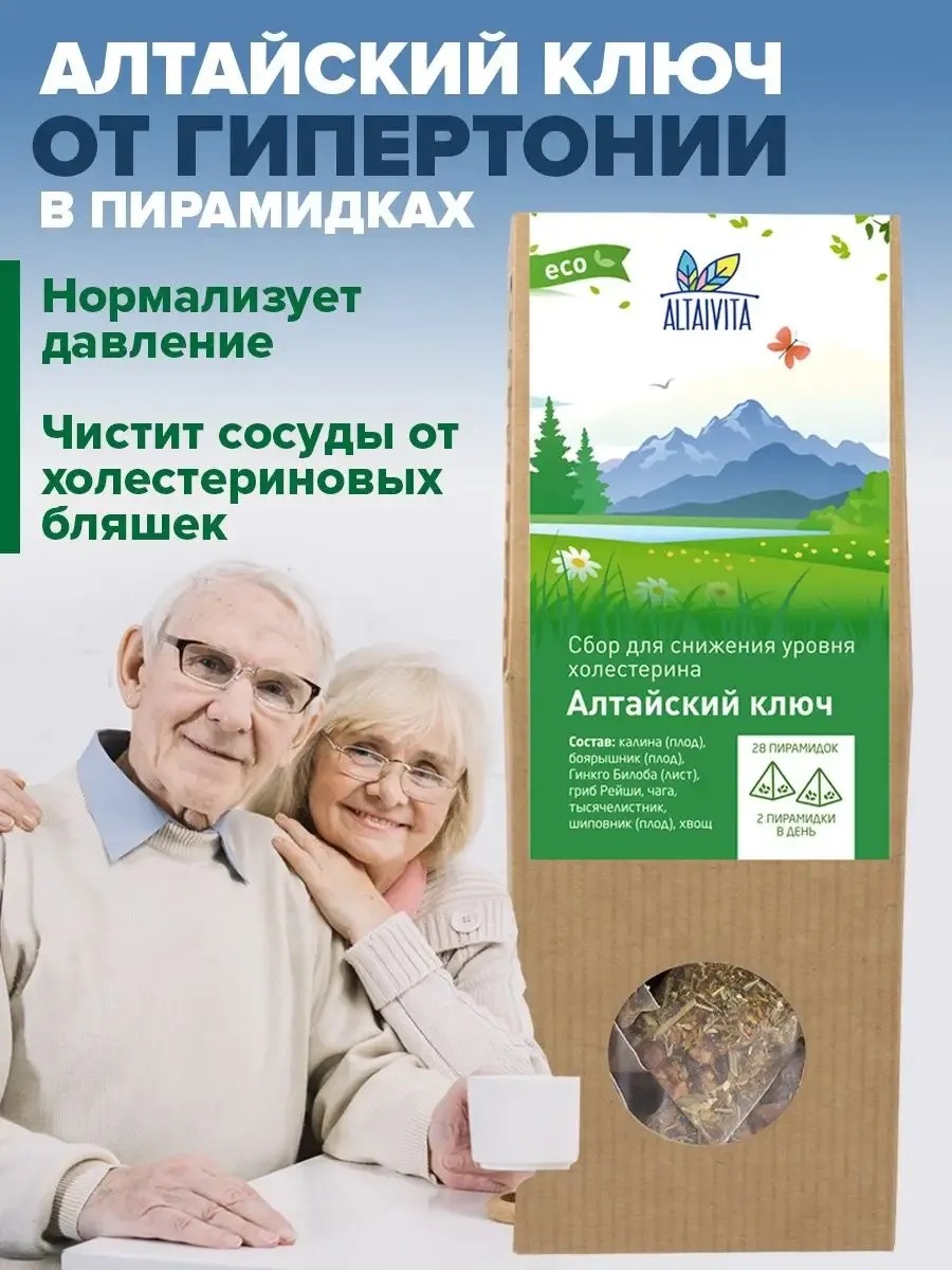 Сочетание трав в сборе способствует повышению эластичности стенок сосудов и снижению тромбообразования. Помимо этого Алтайский ключ отлично борется с воспалительными процессами, тем самым снижая уровень холестерина в крови. Упаковка содержит 28 пирамидок (по 3,5 грамма каждая) и рассчитана на 2 недели употребления. Помимо удобства и быстроты, есть еще одно неоспоримое преимущество пирамидок: сборы в них сбалансированы и тщательно перемешаны. Не нужно беспокоиться о том, верные ли пропорции трав вы положили в заварник-остаётся только залить водой, настоять и пить на здоровье! А после просто выбросить пирамидку и сполоснуть термос.Состав: боярышник (плод), калина (плод), Гинкго Билоба (лист), гриб Рейши, чага, тысячелистник, шиповник (плод), хвощ. Наше средство запускает такой процесс, как чистка сосудов. Алтайский ключ действенное средство от гипертонии. Сбор для сосудов способствует: снижению артериального давления; нормализации уровня холестерина в крови; устранению холестериновых бляшек, очищению и укреплению стенок сосудов; эффективному и безопасному устранению причин гипертонии. Эффект ощутим уже через 14 дней; снижению риска инфаркта и инсульта на 96%.