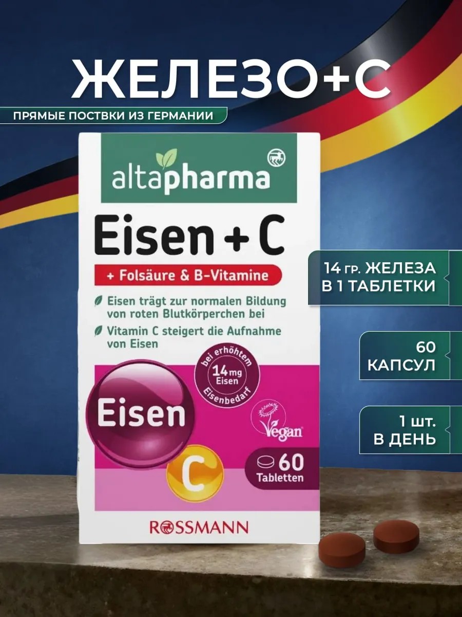 Железо витамины для женщин и мужчин немецкого бренда Altapharma. Пищевая добавка Железо + Витамины идеально подходят для профилактики и коррекции железодефицитных состояний. Высокой биодоступностью отличается хелатное железо с витаминами В С и фолиевой кислотой. Благодаря сбалансированности в его составе используется идеальное содержание железа, которое сводит к минимуму появление побочных эффектов.