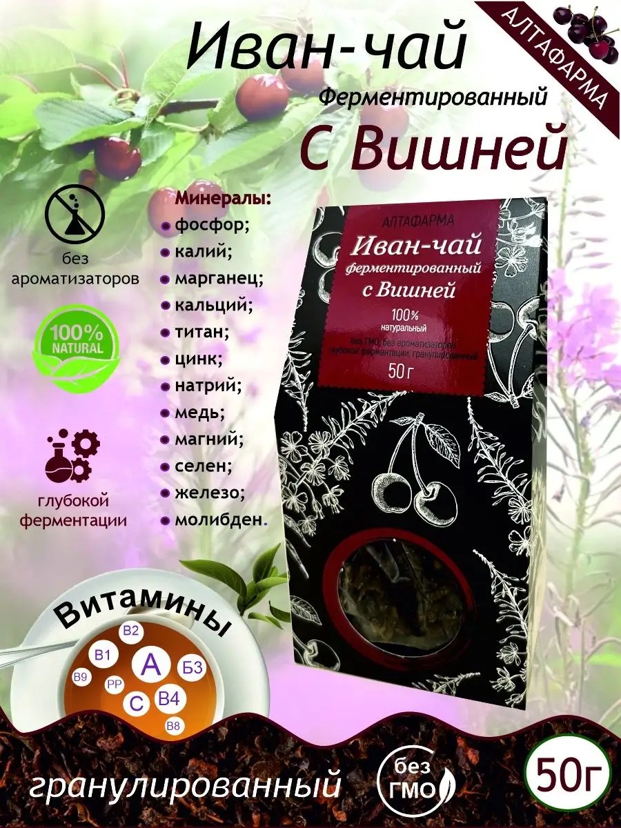 Иван - чай ферментированный с листом вишни, 100% натуральный, без ГМО, без ароматизаторов.