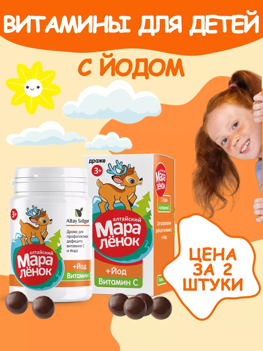 Витамин С и йод в составе витаминизированного драже способствует улучшению процессов развития ребенка и укреплению иммунитета. Драже "Алтайский мараленок" - 100% натуральный витаминизированный продукт для детей без консервантов и вредных добавок. Применяется в качестве специализированного пищевого продукта диетического профилактического питания для детей старше 3 лет - для профилактики дефицита витамина С и йода.