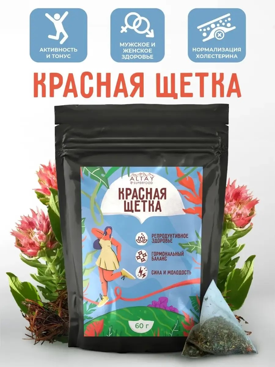 Лечебные травы алтая обладают полезными свойствами. Красная щетка эффективна для лечения женских гинекологических заболеваний, заболеваний мочеполовой системы, нормализует гормональный фон, восстанавливает детородную функцию и избавляет от болевых ощущений при менструации, повышает либидо женское, хороша при климаксе - сбор трав для женщин. Основной особенностью травы является тот факт, что она восстанавливает организм на клеточном уровне. Красный корень служит не только целебным средством против многих заболеваний, но и предупреждает их развитие. Травяной сбор оказывает мощнейший антиоксидантный эффект, благодаря которому происходит быстрое омоложение организма. Красная щетка и боровая матка вместе наиболее эффективны. Сочетание этих целебных трав служит профилактическим средством против онкологических образований. Трава красная щетка улучшает работу ЖКТ, устраняет дисбактериоз, а также быстро снижает повышенную температуру, восстанавливает защитные силы организма и работу эндокринной системы. Красный корень для мужчин обладает свойствами, способными решить такие распространённые мужские проблемы, как аденома простаты, простатит и бесплодие. Используется, как сбор противоопухолевый. Красный корень трава стимулирует похудение. Также популярен травяной сбор в виде настойки от женских болезней, а также, как фито чай травяной.