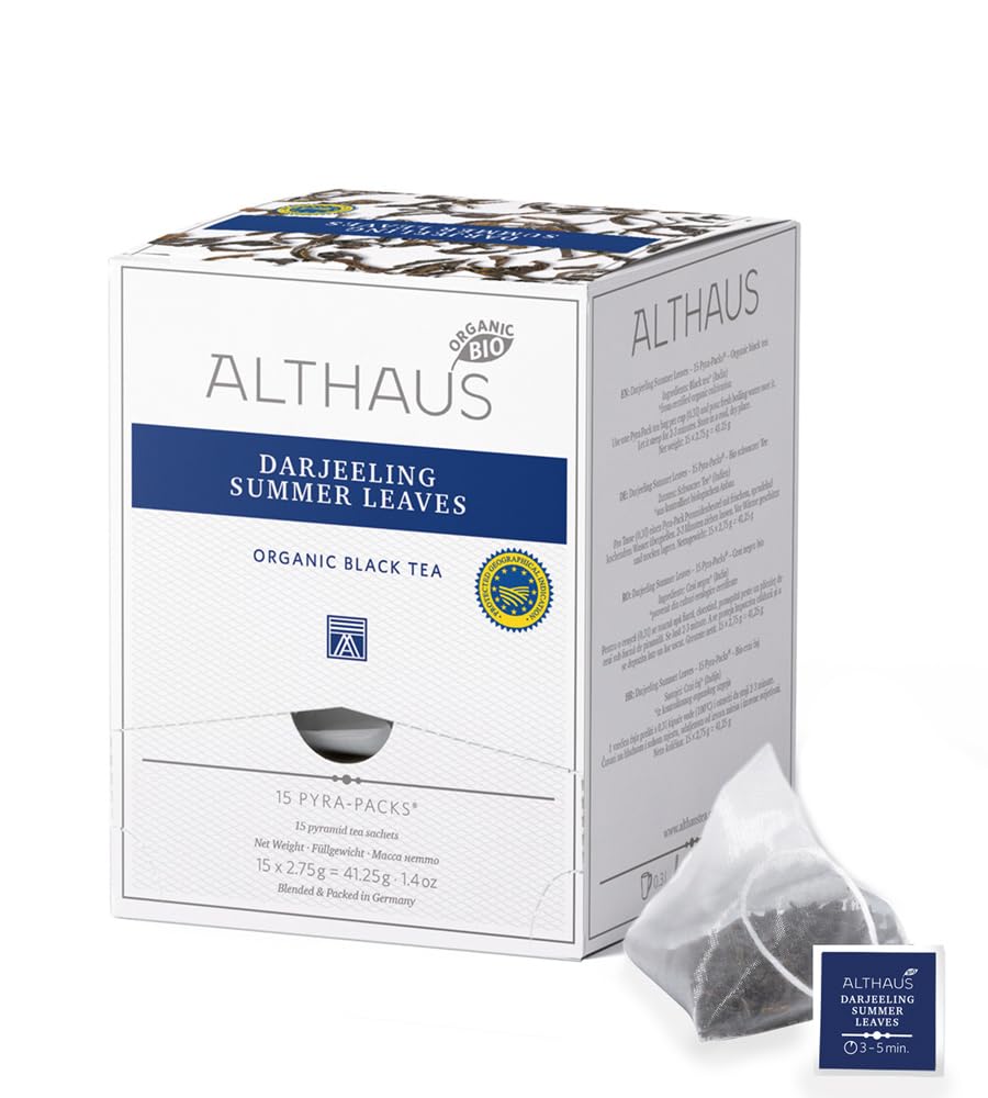 Althaus Tee DARJEELING SUMMER LEAVES (vorher DARJEELING CASTELTON) · Schwarzer Tee im Pyramidenbeutel PYRA PACK · Leichter Schwarztee aus den Teegärten Darjeelings · 15 x 2,75g