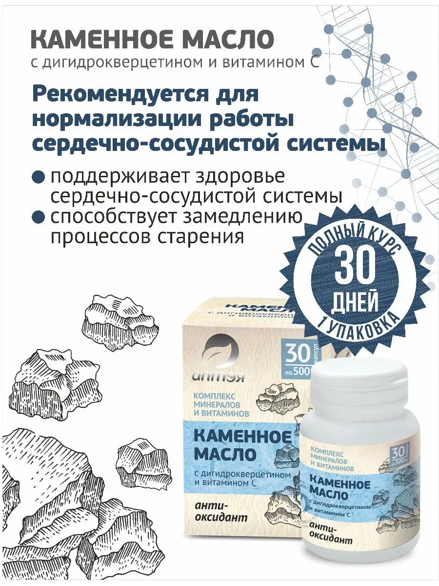 Способ применения: употреблять внутрь по 1 капсуле 1 раз в день утром во время еды, запивая жидкостью. Полный курс - 30 дней (1 упаковка). Каменное масло с дигидрокверцетином и витамином С (Антиоксидант), 30 капсул по 500 мг