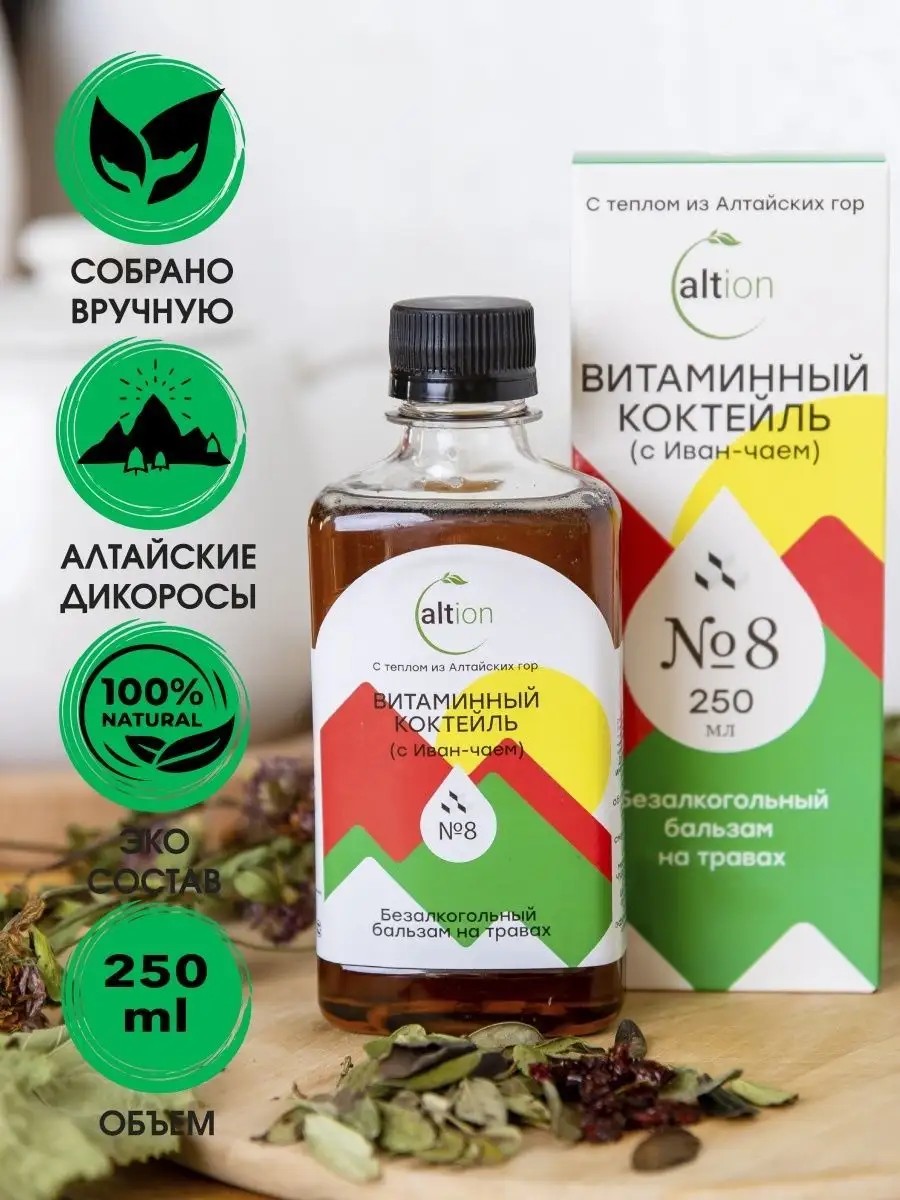 Сироп - безалкогольный бальзам на травах Горного Алтая «Витаминный коктейль» ТМ «Altion» - природные витамины, содержит только натуральные отвары трав. Настой на 10 травах, плодах и цветах.