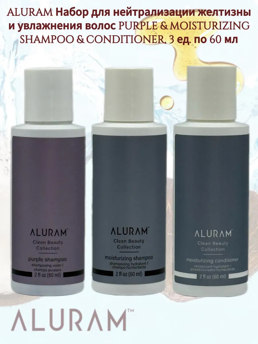 | Комплектация | ALURAM Moisturizing Shampoo Шампунь увлажняющий 60 мл; ALURAM Moisturizing Conditioner Кондиционер увлажняющий 60 мл; ALURAM Purple Shampoo Шампунь для блондированных волос нейтрализующий желтизну 60мл |