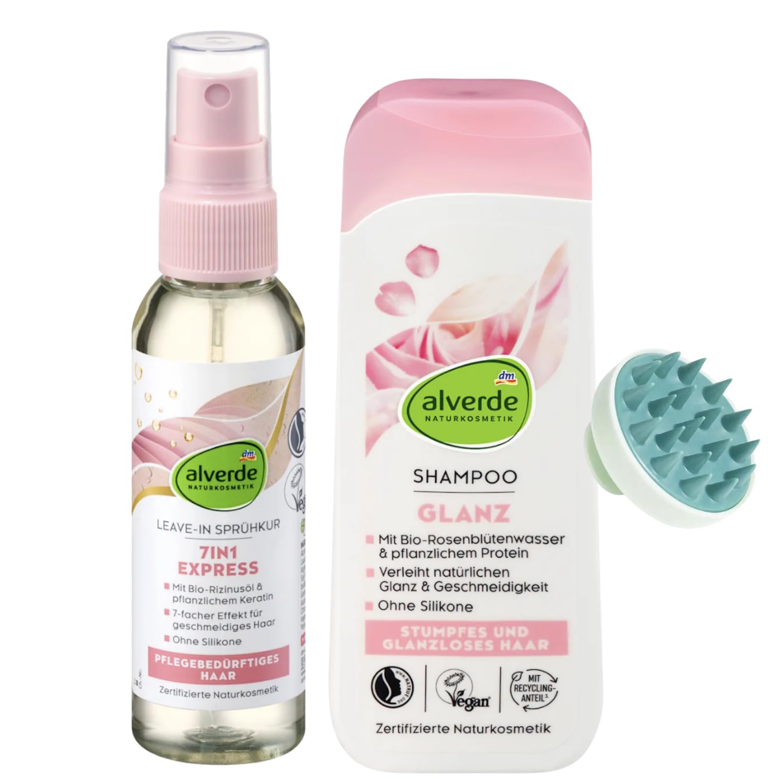 The Alverde 2-pack of natural cosmetics combines intensive hair care and natural shine in a convenient kit. The 7-in-1 Express Leave-In Spray provides instant, complete care for all hair types. Enriched with organic castor oil and plant keratin, it strengthens, hydrates, and softens hair for easier combing and visibly healthier-looking hair, without rinsing. The shine shampoo with organic rose water and plant proteins gently cleanses, nourishes dull hair, and gives it a natural, silky shine. The delicate, floral fragrance pampers the senses. As an added bonus, the scalp massage brush provides a refreshing spa-like experience at home, stimulates scalp circulation, and promotes hair growth. Certified natural cosmetic: gentle, effective, and environmentally friendly. SAFETY WARNING Safety instructions: For external use only. Avoid contact with eyes and mucous membranes. Keep out of reach of children.SUSTAINABLE VEGAN: Environmentally friendly, dermatologically tested, and vegan formulas for natural beauty care. Bonus scalp massage brush: promotes blood circulation, revitalizes the scalp, and encourages healthy hair growth. GENTLE CLEANSING: Free from silicone, parabens, and synthetic fragrances – certified natural cosmetic for all hair types. Naturally shiny hair: Shampoo with organic rose water and plant proteins provides silky shine and soft ends. Fortifying formula: With organic castor oil and plant keratin for noticeably stronger and more supple hair. 7-in-1 intensive treatment: Fortifying leave-in spray nourishes, detangles, and hydrates – no rinsing required.Alverde Lot de 2 sprays Leave-In Express 7 en 1 (75 ml) shampoing brillant à l'eau de pétales de rose et protéines végétales (200 ml) brosse de massage en bonus pour cuir cheveluDESCRIPTION DU PRODUIT DESCRIPTION DU PRODUIT Le lot de 2 cosmétiques naturels Alverde combine un soin intense des cheveux et une brillance naturelle dans un kit de soin pratique. Le spray Leave-In Express 7 en 1 offre un soin complet instantané pour tous les cheveux. Enrichi en huile de ricin bio et en kératine végétale, il fortifie, hydrate et adoucit les cheveux, pour un peignage plus facile et des cheveux visiblement plus sains, sans rinçage. Le shampooing brillance à l'eau de rose bio et aux protéines végétales nettoie en douceur, nourrit les cheveux ternes et donne une brillance naturelle et soyeuse. Le parfum fin et floral dorlote les sens. En outre, la brosse de massage du cuir chevelu en bonus procure une sensation de spa rafraîchissante à la maison, stimule la circulation sanguine du cuir chevelu et favorise la croissance des cheveux. Cosmétique naturel certifié : doux, efficace et respectueux de l'environnement. AVERTISSEMENT DE SÉCURITÉ Consignes de sécurité : usage externe uniquement. Éviter tout contact avec les yeux et les muqueuses. Conserver hors de portée des enfants.DURABLE VÉGAN : formules respectueuses de l'environnement, testées dermatologiquement et végétaliennes pour des soins de beauté naturels. Brosse de massage du cuir chevelu en bonus : favorise la circulation sanguine, revitalise le cuir chevelu et favorise une croissance saine des cheveux. NETTOYAGE DOUX : sans silicone, parabène ni parfum synthétique - Cosmétique naturel certifié pour tous les types de cheveux. Cheveux naturellement brillants : le shampooing à l'eau de rose bio et aux protéines végétales offre une brillance soyeuse et des pointes douces. Formule fortifiante : avec de l'huile de ricin bio et de la kératine végétale pour des cheveux sensiblement plus forts et souples. Soin intensif 7 en 1 : spray sans rinçage fortifiant, nourrit, démêle et hydrate – sans rinçage.