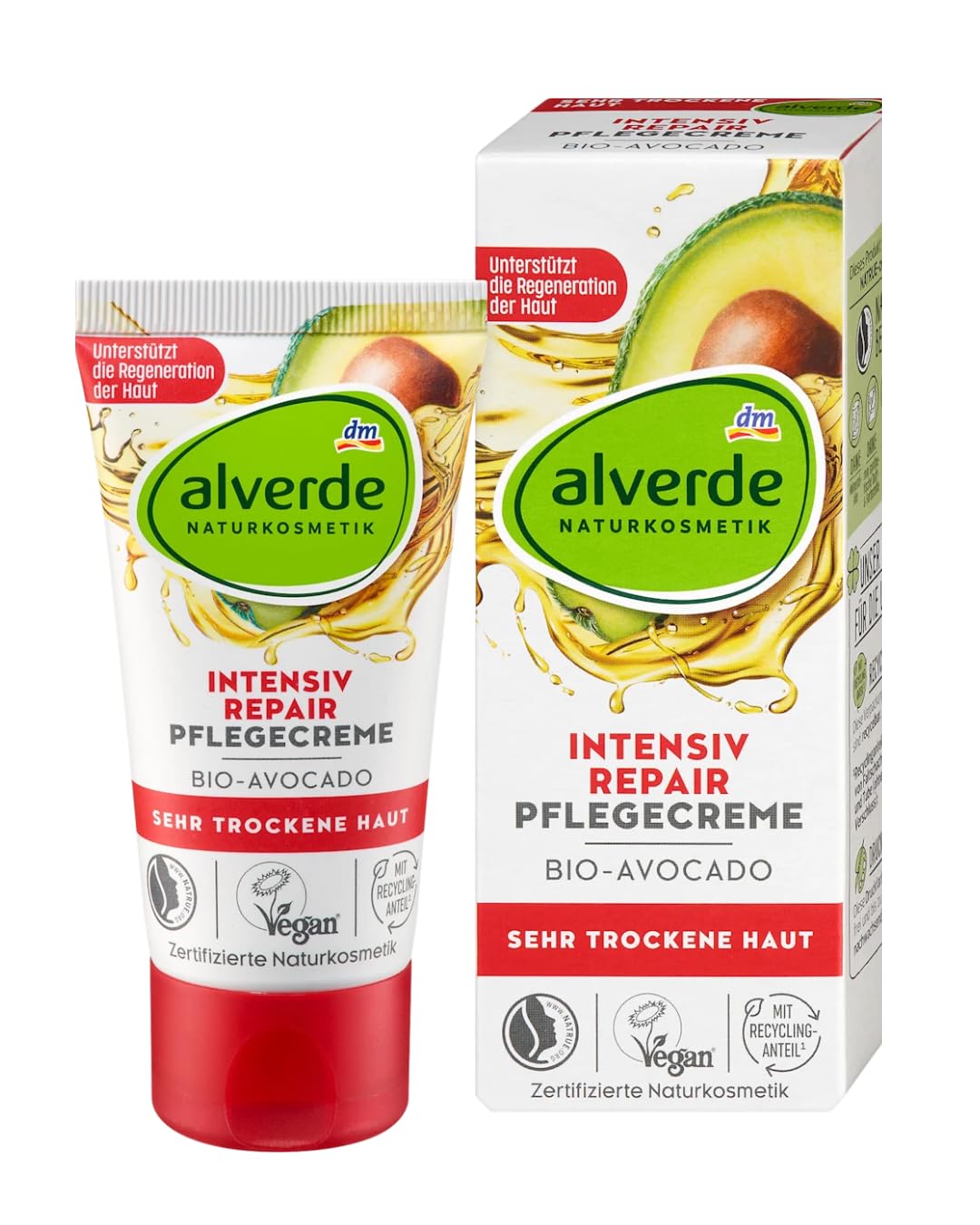 Soothes and supports skin regeneration, provides elasticity, and provides lasting moisture. It reduces the appearance of dry lines and feelings of tension. The Alverde Natural Cosmetics Intensive Repair Avocado Care Cream provides lasting moisture to the skin. Organic avocado oil has a very high percentage of valuable skin-related lipids and, despite its richness, is characterized by its suppleness. Avocado oil supports the skin's barrier function and is particularly suitable for intensive care of very dry skin. This formula is free from microplastics and water-soluble, purely synthetic polymers. SAFETY WARNING: Apply the cream to the face, neck, and décolleté morning and evening, or as needed after cleansing. For natural cleansing and purification of your skin, we recommend Alverde Cleansing Milk Organic Wild Rose and Alverde Facial Toner Organic Wild Rose.alverde NATURKOSMETIK Face Cream Intensive Repair, 50 ml.alverde NATURKOSMETIK Gezichtscrème Intensiv Repair, 50 ml Kalmeert en ondersteunt de regeneratie van de huid, geeft elasticiteit en hydrateert de huid duurzaam van vocht. Droogheidsrimpels en spanningsgevoelens worden verminderd. De Alverde Natural Cosmetics Intensiv Repair verzorgingscrème avocado verzorgt de huid duurzaam van vocht. De biologische avocado-olie heeft een zeer hoog aandeel waardevolle huidverwante lipiden en onderscheidt zich ondanks zijn rijkdom door zijn soepelheid. Avocado-olie ondersteunt de barrièrefunctie van de huid en is bijzonder geschikt voor de intensieve verzorging van zeer droge huid. Recept zonder microplastic en in water oplosbare puur synthetische polymeren. VEILIGHEIDSWAARSCHUWING Breng de crème 's ochtends en' s avonds of indien nodig na het reinigen aan op gezicht, hals en decolleté. Voor de natuurlijke reiniging en zuivering van je huid adviseren wij de Alverde Cleansing Milk Bio-Wilde Rose en de Alverde gezichtswater biologische wilde roos.alverde NATURKOSMETIK Gezichtscrème Intensiv Repair, 50 ml.