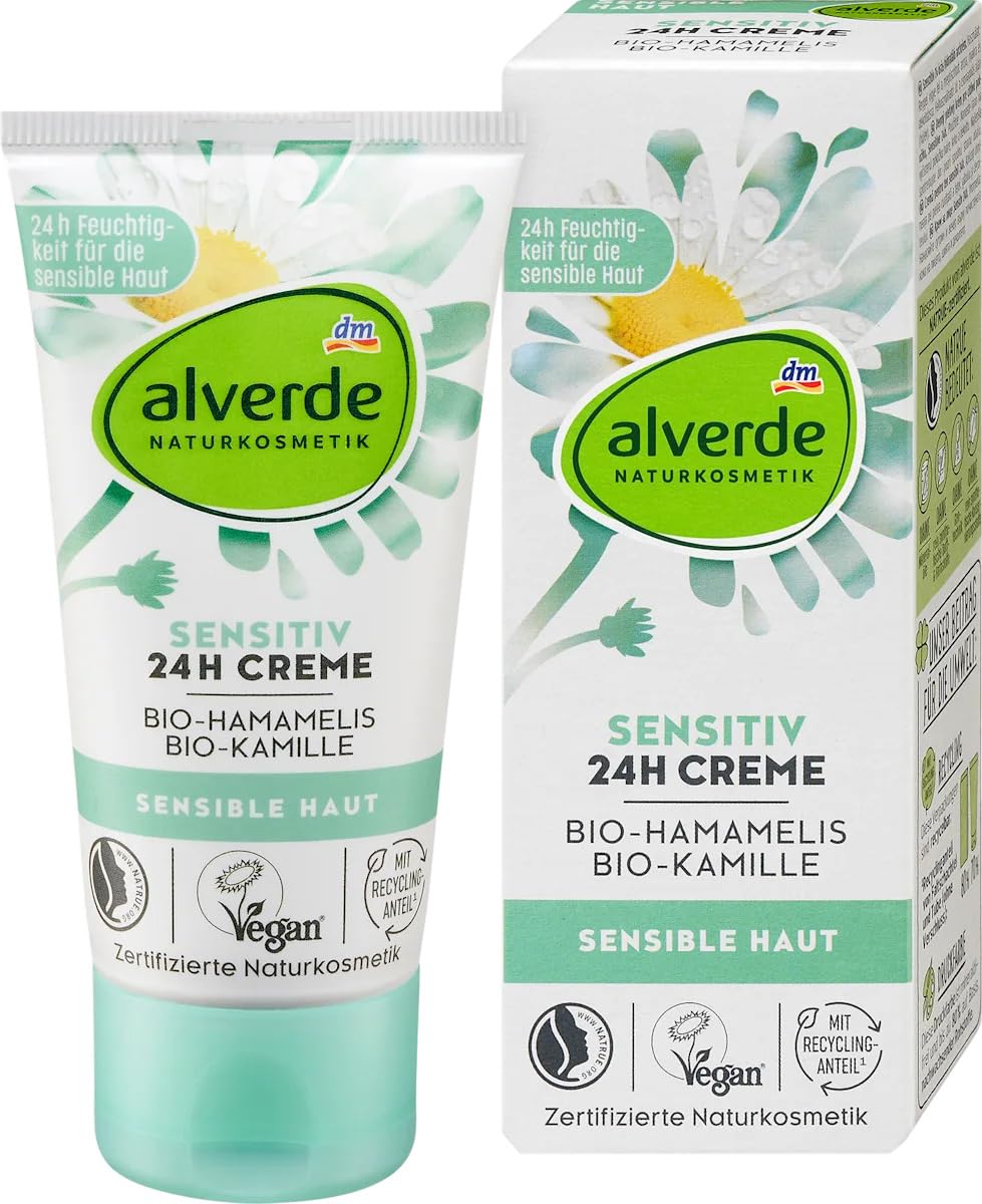 The 'alverde NATURKOSMETIK Sensitiv 24h cream' is a high-quality care product for sensitive and dry skin. The cream is particularly suitable for face and body and convinces with its special formula with organic witch hazel and organic chamomile blossom extract. These natural ingredients are known for their soothing and nourishing effect. The cream is also vegan, free of paraffins, parabens, aluminum salts, dyes, nanoparticles and preservatives. It also contains natural skin care oils and mango and shea butter, which provide the skin with lasting moisture. The formula is also free from microplastics and water-soluble synthetic polymers. The cream is available in a practical tube with a 50 ml capacity. SAFETY WARNING Not applicableArea of application: face and body - versatile for face and body care. Ingredients: Natural and organic ingredients, such as organic witch hazel extract and organic chamomile blossom extract. Target group: sensitive skin - specially formulated for sensitive skin. Size: 50 ml - Practical travel size for on the go. Brand: alverde NATURKOSMETIK - A trusted name for natural cosmetics.alverde NATURKOSMETIK Sensitiv 24h Crème, 50 ml, gezichts- en lichaamscrème voor de gevoelige huid, veganistisch, natuurlijke cosmetica, zonder paraffine minerale oliën De 'alverde NATURKOSMETIK Sensitiv 24h crème' is een hoogwaardig verzorgingsproduct voor de gevoelige en droge huid. De crème is bijzonder geschikt voor gezicht en lichaam en overtuigt door zijn speciale formule met biologische toverhazelaar en biologische kamillebloesemextract. Deze natuurlijke ingrediënten staan bekend om hun rustgevende en voedende werking. De crème is bovendien veganistisch, vrij van paraffines, parabenen, aluminiumzouten, kleurstoffen, nanodeeltjes en conserveringsmiddelen. Het bevat bovendien natuurlijke huidverzorgingsoliën en mango- en sheaboter, die de huid duurzaam van vocht voorzien. De formule is bovendien vrij van microplastics en in water oplosbare synthetische polymeren. De crème is verkrijgbaar in een praktische tube met 50 ml inhoud. VEILIGHEIDSWAARSCHUWING Niet van toepassingToepassingsgebied: gezicht en lichaam - veelzijdig inzetbaar voor gezicht en lichaamsverzorging. Ingrediënten: Natuurlijke en biologische ingrediënten, zoals biologisch toverhazelaarextract en biologische kamillebloesemextract. Doelgroep: gevoelige huid - speciaal samengesteld voor de gevoelige huid. Formaat: 50 ml - Praktisch reisformaat voor onderweg. Merk: alverde NATURKOSMETIK - Een vertrouwde naam voor natuurlijke cosmetica.