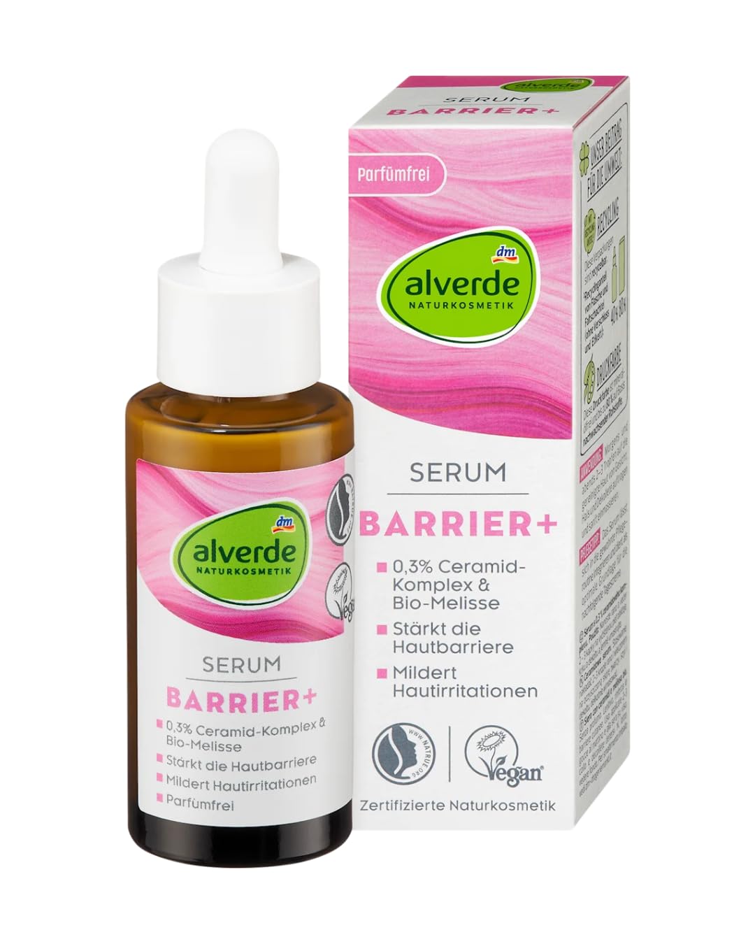 Gentle facial care strengthens the skin protection barrier, protecting against moisture loss and dryness wrinkles. Alverde's Barrier serum can strengthen the skin protection barrier and improve resistance. Thanks to the ceramide complex and organic balm extract, skin regeneration is stimulated and protected against moisture loss. In addition, feelings of tension and dry skin areas are relieved. Recipe without microplastic and water-soluble purely synthetic polymers. SAFETY WARNING Apply 2-3 drops to the cleansed skin of the face, neck and décolleté in the morning and evening and massage in gently. The serum can be ideally integrated into the usual care routine. Serves as an optimal base for the next day creamalverde NATURKOSMETIK Serum Barrier , 30 ml.alverde NATURKOSMETIK Serum Barrier , 30 ml Zachte gezichtsverzorging versterkt de huidbeschermingsbarrière, bescherming tegen vochtverlies en droogheidsrimpels. Het serum Barrier van Alverde kan de huidbeschermingsbarrière versterken en de weerstand verbeteren. Dankzij het ceramidecomplex en biologisch melisse-extract wordt de regeneratie van de huid gestimuleerd en beschermd tegen vochtverlies. Bovendien worden spanningsgevoelens en droge huidplekken verlicht. Recept zonder microplastic en in water oplosbare puur synthetische polymeren. VEILIGHEIDSWAARSCHUWING 's ochtends en 's avonds 2-3 druppels op de gereinigde huid van gezicht, hals en decolleté aanbrengen en zachtjes inmasseren. Het serum kan ideaal in de gebruikelijke verzorgingsroutine worden geïntegreerd. Dient als optimale basis voor de volgende dagcrèmealverde NATURKOSMETIK Serum Barrier , 30 ml.