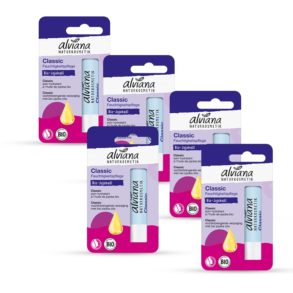 Gentle, long-lasting lip care for the whole family. Alviana Classic Lip Balm (pack of 5) offers simple but effective care for delicate lips. This classic lip balm is the perfect solution for long-lasting hydration and protection for everyone in your family. Whether you're dealing with dry, cracked lips or just need daily hydration, this lip balm will keep your lips soft and nourished. Formulated with organic jojoba oil, shea butter, beeswax and olive oil, it delivers rich hydration and helps repair dry lips, leaving them smooth and protected all day long. The combination of organic ingredients ensures your lips get the care they deserve without harsh chemicals or artificial additives. Environmentally friendly and sustainable. Alviana cares about both your lips and the environment. The packaging is made from 92 recycled materials, helping you make a more sustainable choice while caring for your family's lips. Instructions for use: Apply directly to your lips whenever you need for long-lasting hydration and softness. Ideal for daily use and particularly effective in cold or dry weather. Ingredients: You can trust. Made with certified organic ingredients like jojoba oil, shea butter and beeswax, this lip balm is perfect for sensitive skin and free from synthetic additives. Choose the Alviana Classic Lip Balm of 5 for a simple, effective and eco-friendly solution for your family's lip care. SAFETY WARNING Keep out of reach of children.Perfect for Sensitive Lips: Gentle formula ideal for all ages, from children to adults, providing soothing care. Eco-Friendly Packaging: Outer packaging made from 92 recycled materials, supporting a sustainable lifestyle. Enriched with Organic Ingredients: Made with organic jojoba oil, shea butter, beeswax, and olive oil to nourish and moisturize lips. Classic Lip Care: A timeless lip balm that essentially moisturizes, leaving lips soft and protective. Family Care 5-Pack: Five lip balms designed to provide long-lasting moisture and care for the whole family. Soin des lèvres doux et durable pour toute la famille. Le baume à lèvres classique Alviana (lot de 5) offre un soin simple mais efficace pour des lèvres délicates. Ce baume à lèvres classique est la solution parfaite pour une hydratation longue durée et une protection pour tous les membres de votre famille. Que vous ayez besoin de lèvres sèches, craquelées ou que vous ayez simplement besoin d'hydratation quotidienne, ce baume à lèvres gardera vos lèvres douces et nourries. Formulé avec de l'huile de jojoba biologique, du beurre de karité, de la cire d'abeille et de l'huile d'olive, il offre une hydratation riche et aide à réparer les lèvres sèches, les laissant lisses et protégées tout au long de la journée. La combinaison d'ingrédients organiques garantit que vos lèvres reçoivent le soin qu'elles méritent sans produits chimiques agressifs ni additifs artificiels. Respectueux de l'environnement et durable. Alviana cares about both your lips and the environment. L'emballage est fabriqué à partir de 92 de matériaux recyclés, ce qui vous aide à faire un choix plus durable tout en prenant soin des lèvres de votre famille. Mode d'emploi : Appliquez directement sur vos lèvres chaque fois que vous en avez besoin pour une hydratation et une douceur durables. Idéal pour une utilisation quotidienne et particulièrement efficace par temps froid ou sec. Ingrédients : vous pouvez faire confiance. Fabriqué avec des ingrédients biologiques certifiés comme l'huile de jojoba, le beurre de karité et la cire d'abeille, ce baume à lèvres est parfait pour les peaux sensibles et exempt d'additifs synthétiques. Choisissez le baume à lèvres classique Alviana de 5 pour une solution simple, efficace et écologique pour le soin des lèvres de votre famille. AVERTISSEMENT DE SÛRETÉ Tenir hors de portée des enfants.Parfait pour les lèvres sensibles : formule douce idéale pour tous les âges, des enfants aux adultes, offrant des soins apaisants. Emballage écologique : emballage extérieur fabriqué à partir de 92 de matériaux recyclés, soutient un style de vie durable. Enrichi avec des ingrédients biologiques : fabriqué avec de l'huile de jojoba biologique, du beurre de karité, de la cire d'abeille et de l'huile d'olive pour nourrir et hydrater les lèvres. Soin des lèvres classique : un baume à lèvres intemporel qui hydrate essentiellement, laisse les lèvres douces et protectrices. Lot de 5 pour les soins familiaux : cinq baumes à lèvres conçus pour offrir une hydratation longue durée et un soin à toute la famille.