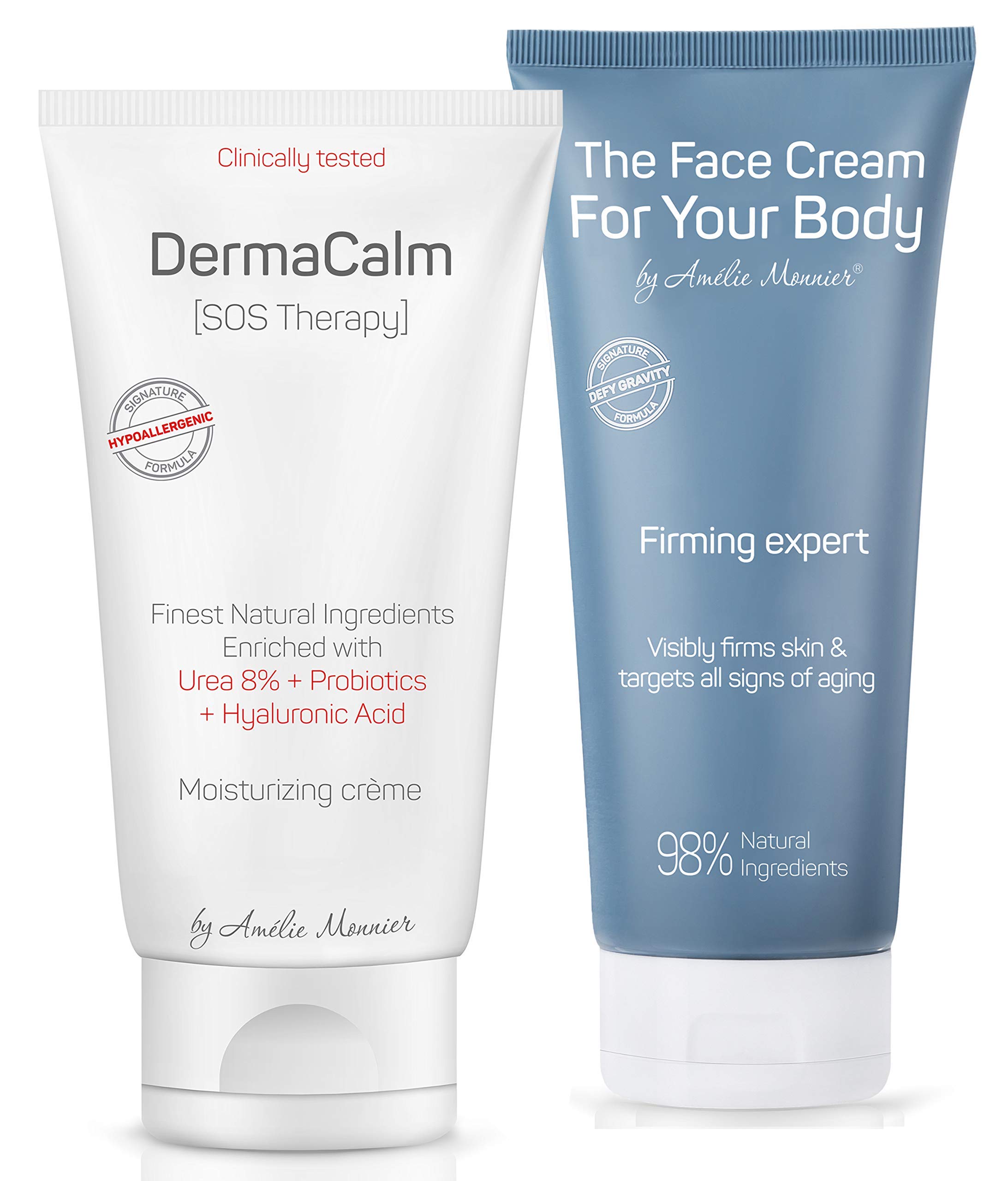 This combo set includes our Signature DermaCalm SOS Therapy for Eczema Psoriasis Dermatitis and our New European Hi-tech Tightening Collagen Repair Cream with Hyaluronic Acid in the 50-3000 kDa Molecular SpectrumBoth: SAFETY FIRST - Preservative-free, Silicone Paraben-free, Palm Mineral oil-free, Phenoxyethanol-free, PEG Petroleum-free, Never tested on animals, Alcohol Colorant-free, Gluten-free. Sustainable approach for lasting beauty. The Face Cream For Your Body: WE STRIVE TO GET YOUR SKIN TO REFLECT YOUR NATURAL BEAUTY - Clinical trials of the active ingredients in this anti-aging formula have shown that they: Reactivate collagen synthesis ( 24 collagen I, 28 collagen IV, 51 collagen VII) Enable 55 to 125 greater permeation than "classic" hyaluronic acids Deliver a visible increase in skin elasticity of up to 13 in 30 min Provide 100 effective detoxification. DermaCalm: IT'S ALL BEHIND THE SCENES: The synergy of the powerful moisturizing complex (8 urea, hyaluronic acid and shea), working together with active yogurt probiotics, rose oil and bisabolol, accelerates the healing of extremely dry, flaky skin often associated with eczema, atopic dermatitis, and psoriasis. Clinical trials have conclusively shown compounds within these ingredients to increase hydration, stimulate cellular respiration, and improve the overall health of the skin. The Face Cream For Your Body: THE SCIENCE BEHIND HIGH-END FACIAL SERUMS, NOW FOR YOUR BODY - This repair treatment blends key anti-aging ingredients typically found in facial serums into a rejuvenating body lotion. The intensive anti-wrinkle collagen cream, powered by Marine- Plant-based actives, combined with multi-weighted Hyaluronic Acid, plumps skin and visibly reduces the appearance of wrinkles caused by aging and excessive sun exposure. Best for face, neck, chest, hands, arms and legs. DermaCalm: MAKE PEACE WITH YOUR BODY by relieving the 4 symptoms of extra dry skin - redness, roughness, itching and flaking. Our breakthrough formula seals in moisture and repairs the damaged skin barrier for long-lasting relief. Feel the rough, cracked patches soften, keep outbreaks under control and say goodbye to irritating itches. The product of decades of European research excellence, DermaCalm moisturizes your skin to its core, rather than simply adding a greasy layer like other ointments.