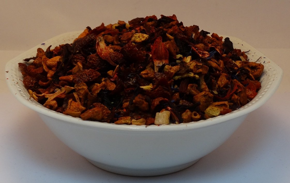 This premium fruit tea blend, a favorite for years, is distinguished not only by its perfectly balanced flavor but also by its appealing presentation. A superb tea to enjoy with young and old alike during the cold winter and Christmas days. Notes of Christmas almond cherry and cinnamon blend harmoniously with the fruit. INGREDIENTS Potatoes, hibiscus flowers, sweetcorn peel, orange peel, grated coconut, almonds, diced pineapple (pineapple, sugar), flavoring, thistle coloring, cornflower petals. INSTRUCTIONS Approx. 4-5 heaped teaspoons per liter, water temperature 100 C, brewing time approx. 10 minutes. See more