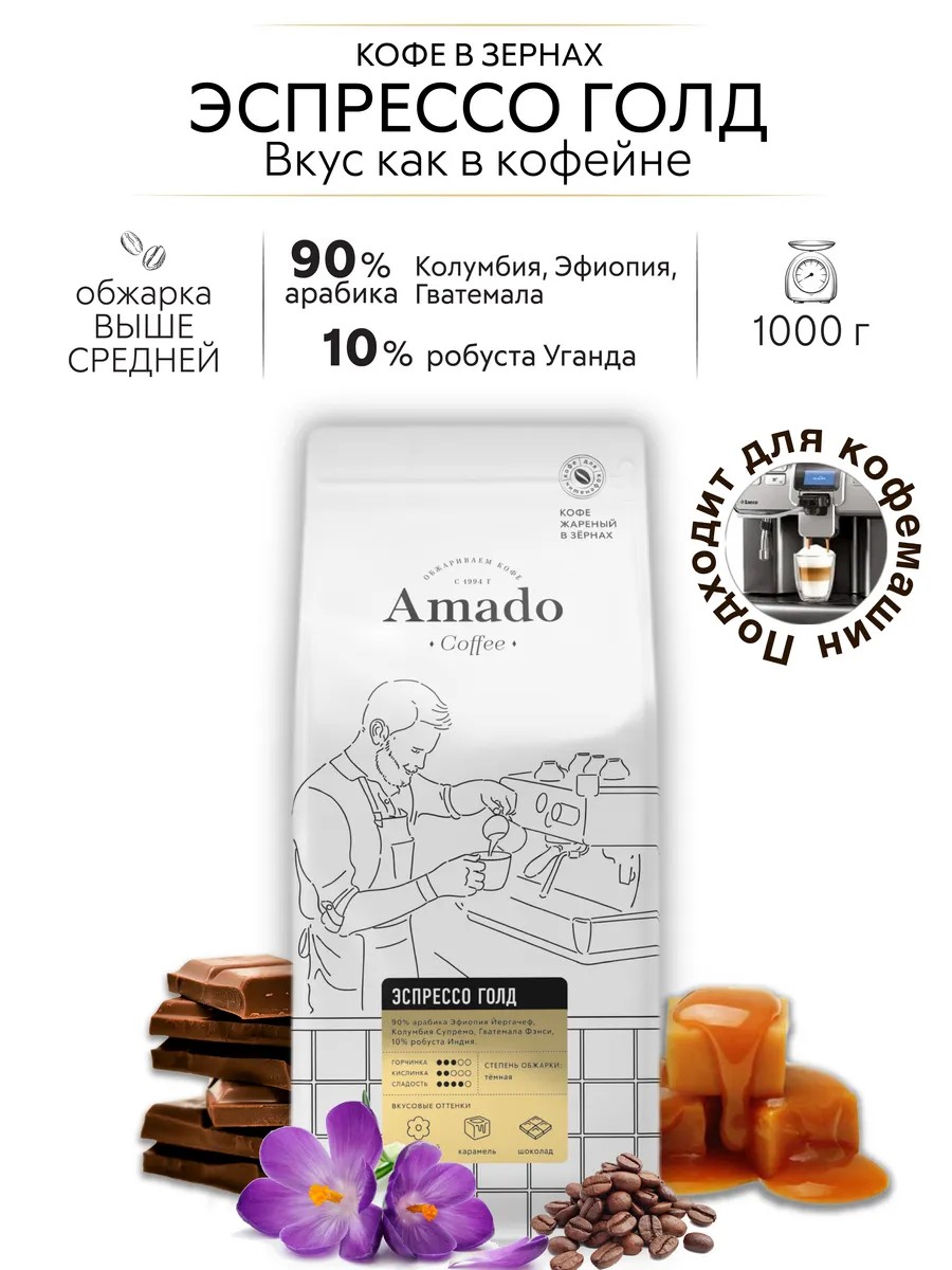 Натуральный свежеобжаренный кофе в зернах Эспрессо - это 90% арабика из Эфиопии Йергачеф, Гватемалы Фэнси, Колумбии Супремо и 10% робуста из Индии средней обжарки.Этот зерновой кофе идеально подойдет для кофемашины, турки, фильтра. Вы сможете приготовить идеальный эспрессо, капучино или латте.Кофе Эспрессо Голд обладает лёгкой шоколадно-карамельной горчинкой. Нежный цветочный аромат.Кофейный бренд AMADO уже более 25 лет работает на российском рынке. Обжаривать кофе мы стали одними из первых в стране в 1994 г. На тот момент мы не ставили перед собой задачу массового производства и сконцентрировались на бережной обжарке элитных сортов кофе малыми партиями. Так нашим специалистам удавалось наилучшим образом контролировать строгое соблюдение высоких стандартов качества. Мы работаем только с проверенными, надежными поставщиками кофе. Африка, Индия, Индонезия, Южная и Центральная Америка – со всех уголков Земли, где растёт кофе, мы выбираем самые многообещающие и интересные, насыщенные, ароматные, вкусные сорта и привозим в Россию, на своё производство.Собственная технология бережной обжарки подразумевает два основных условия:Обжарка кофе малыми партиями, чтобы каждое зерно обжаривалось равномерно изнутри и снаружи.Индивидуальный подбор температуры и времени обжарки для каждого сорта кофе.Для обжарки мы используем ростер Petroncini, разработанный на родине эспрессо в Италии, что позволяет нам наиболее полно раскрывать букет вкуса и аромата кофе Амадо.После обжарки кофе нам очень важно донести его в надлежащем качестве до потребителя. Поэтому мы используем плотную непрозрачную упаковку с дегазационным клапаном, которая не позволяет свету и воздуху навредить вкусовым и ароматическим свойствам кофе и, в то же время, не препятствует тому, чтобы потребитель смог почувствовать аромат продукта, держа в руке пачку.Мы поставляем только свежеобжаренный кофе, поэтому интервал между обжаркой и поставкой кофе на склад маркетплейса составляет не более 2-х дней.Натуральный зерновой кофе в пакете 1 кг. - отличный подарок и женщинами, и мужчинам. Вы можете подарить его маме или папе на день рождения или другой праздник.