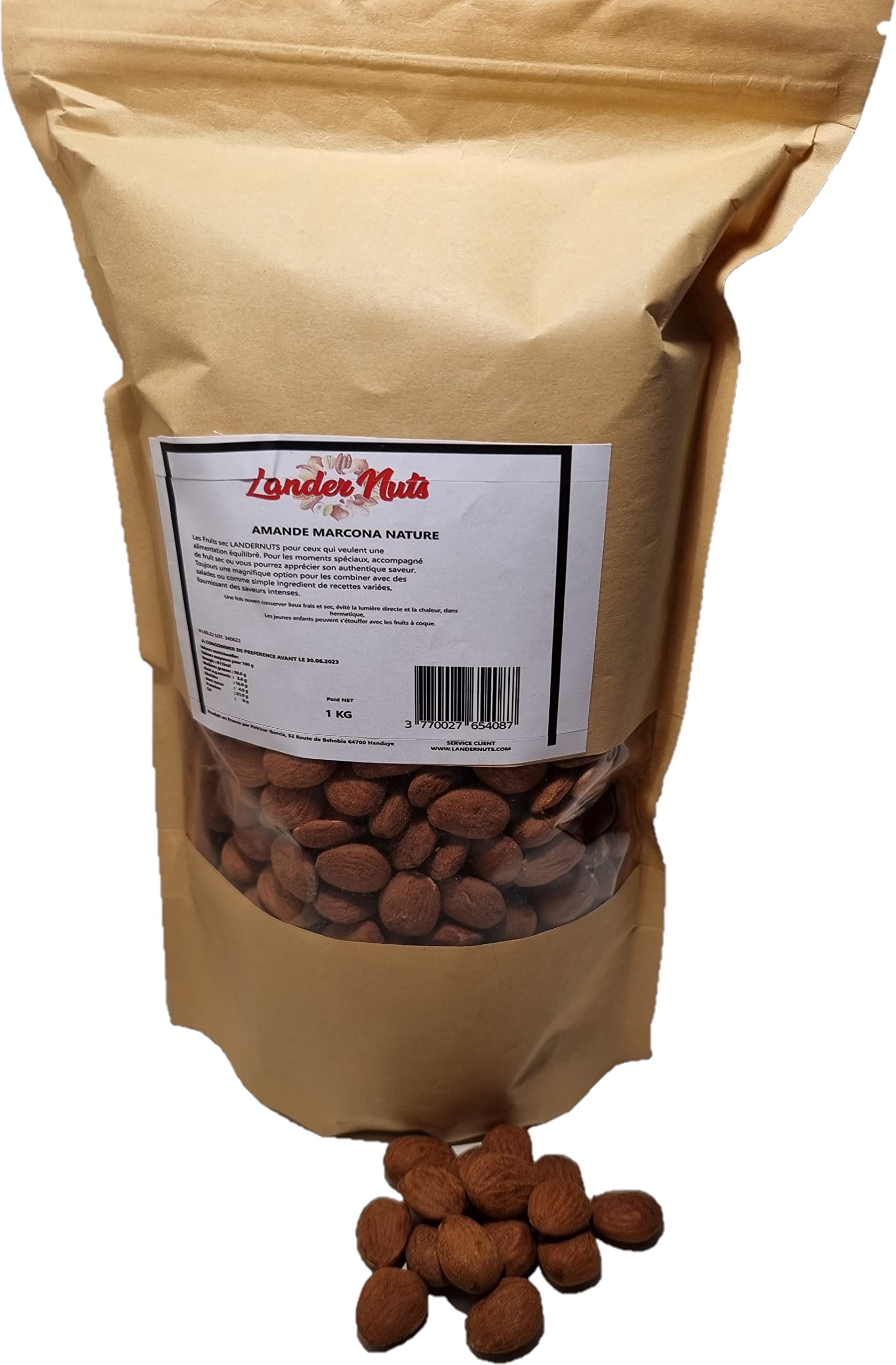 : 100 Natural Marcona Almonds, doypack format. Exclusive taste for this Spanish almond. Instructions for use: Consume as is.100 natural almond.Description du produit Amande Marcona 100 Nature , format doypack. Gout exclusif pour cette amande Espagnole Mode d'emploi Consommer telles quellesAmande naturelle 100 .Amande Marcona Extra Espagnole 100 nature Landernuts 1 kg