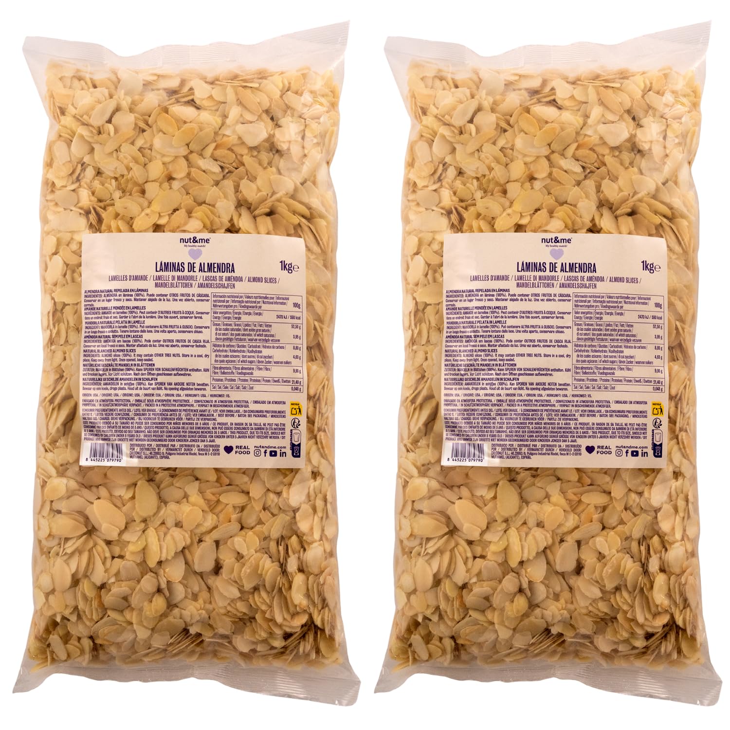 ? IDEAL FOR CHRISTMAS CELEBRATIONS: Sliced almonds are an essential ingredient in Christmas and Epiphany cooking, adding a touch of elegance and flavor to your festive treats and traditional dishes. ? SKINLESS AND NATURAL: Enjoy the convenience of skinless almonds, ready to eat or add to your favorite dishes, with no preservatives or additives, preserving all their natural flavor. ? SOURCE OF NUTRIENTS: Rich in protein, fiber, and essential fatty acids, sliced almonds are a perfect addition to a balanced diet, helping to maintain a healthy lifestyle. ? FOR BAKING LOVERS: These sliced almonds are ideal for baking, adding a crunchy texture and delicate flavor to your homemade pies, cookies, and desserts. ? SUPERIOR QUALITY: Rolled almonds, carefully selected to guarantee the highest quality. Sourced from Spanish orchards, they are renowned for their authentic taste and unique texture.? IDÉALES POUR LES CÉLÉBRATIONS DE NOËL : Les amandes laminées sont un ingrédient essentiel en cuisine pendant Noël et l'Épiphanie, ajoutant une touche d'élégance et de goût à vos douceurs festives et plats traditionnels. ? SANS PEAU ET NATURELLES : Profitez de la commodité des amandes sans peau, prêtes à consommer ou à ajouter à vos plats préférés, sans conservateurs ni additifs, préservant toute leur saveur naturelle. ? SOURCE DE NUTRIMENTS : Riches en protéines, en fibres et en acides gras essentiels, les amandes laminées sont un complément parfait pour un régime équilibré, contribuant à maintenir un mode de vie sain. ? POUR LES AMOUREUX DE LA PÂTISSERIE : Ces amandes laminées sont idéales pour la pâtisserie, apportant une texture croquante et une saveur délicate à vos tartes, biscuits et desserts maison. ? QUALITÉ SUPÉRIEURE : Amandes laminées, soigneusement sélectionnées pour garantir la plus haute qualité. Provenant de cultures espagnoles, elles sont reconnues pour leur goût authentique et leur texture unique.Amandes efilées 2 kg nut me Tranches d'amandes blanchies Amandes crues Sans additifs ni conservateurs Sources de protéines Sans sel Pack 2 x 1 kg Amandes efilées 2000