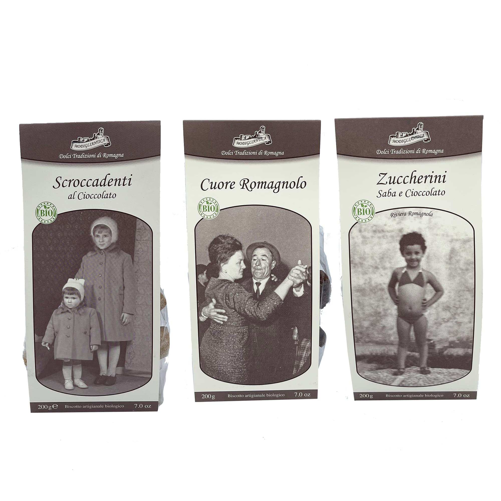 Sweet Traditions of Romagna Trio of Organic Artisan Shortbread Biscuits: CHOCOLATE CROCCADENTS, ROMAGNOLO HEART, ZUCCHERINI SABA AND CHOCOLATE 200g x 3. Made with organic flours from ancient stone-ground grains, a selection of authentic local products, images and family portraits that tell the story of a Romagna of bygone times. thus, our biscuits are born with respect for tradition. CHOCOLATE CROCCADENTS: soft wheat flour type 2, cane sugar, egg, sunflower seed oil, 7 chocolate (cocoa mass, cane sugar, soy lecithin), raising agents: cremoro, sodium bicarbonate, salt. ROMAGNOLO HEART: soft ancient grain flour type 2 (Italy, Hemilia-Romagna), cane sugar, sunflower oil, egg, cocoa powder, raising agents: cremoro, sodium bicarbonate, salt. Zuccherini sand and chocolate: type 2 ancient soft grain flour (Italy, Hemilia-Romagna), cane sugar, sunflower seed oil, egg, 2.5 chocolate (cocoa mass, cane sugar, soy lecithin), 2 sand (Cott grape must), raising agents: cremor tort, bicarbonate, bicarbonate, bicarbonate, bicarbonate. Food sodium bicarbonate, salt.Douces Traditions de Romagna Tris de Biscuits secs artisanaux biologiques SCROCADANTES AU CŒUR ROMAGNOLO, Sucettes sable et chocolat 200 g x 3DESCRIPTION DU PRODUIT Douces Traditions de Romagne Tris de Biscuits secs artisanaux biologiques SCROCCADIENTS AU CHOCOLAT, CŒUR ROMAGNOLO, ZUCCHERINI SABA ET CHOCOLAT 200 g x 3 farines biologiques de grains anciens moulés à pierre, une sélection de produits authentiques du territoire, images et portraits de famille qui racontent une Romagne autres temps. ainsi Nos biscuits naissent dans le respect des traditions. CHROCADENTS AU CHOCOLAT : farine de blé tendre type 2, sucre de canne, œuf, huile de graines de tournesol, chocolat 7 (pâte de cacao, sucre de canne, lécithine de soj), agents levants : cremor tors, bicarbonate de sodium alimentaire, sel. CŒUR ROMAGNOL: farine de grains tendres anciens type 2 (italie, hémilia-romagne), sucre de canne, huile de tournesol, œuf, cacao en poudre, agents livitants : cremor toral, bicarbonate de sodium alimentaire, sel. Zuccherini sable et chocolat : farine de grains tendres anciens type 2 (italie, hémilia-romagne), sucre de canne, huile de graines de tournesol, œuf, chocolat 2,5 (pâte de cacao, sucre de canne, lécithine de soje), sable 2 (moût de raisin cott), agents livitants : crémor tort, bicarit, bicarctarte, bicarctartre, bicarctartre, bicarctartre, bicarctu. Bonate de sodium alimentaire, sel.