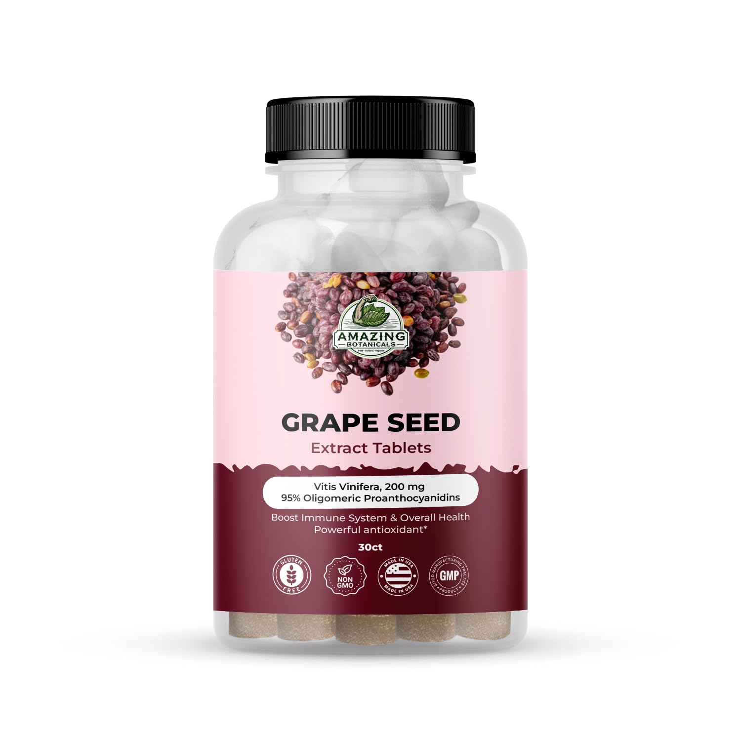 Amazing Botanicals Grape Seed Extract Tablets 30ct - 200mg Maximum Strength 95% Proanthocyanidins Standardized Extract - Immune System Booster - Antioxidants Supplement for Overall Health