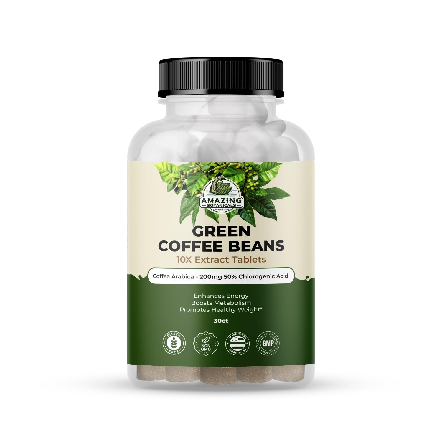Amazing Botanicals Green Coffee Bean Extract Tablets - Coffea Arabica - 200mg 50% Chlorogenic Acid - 30 Count