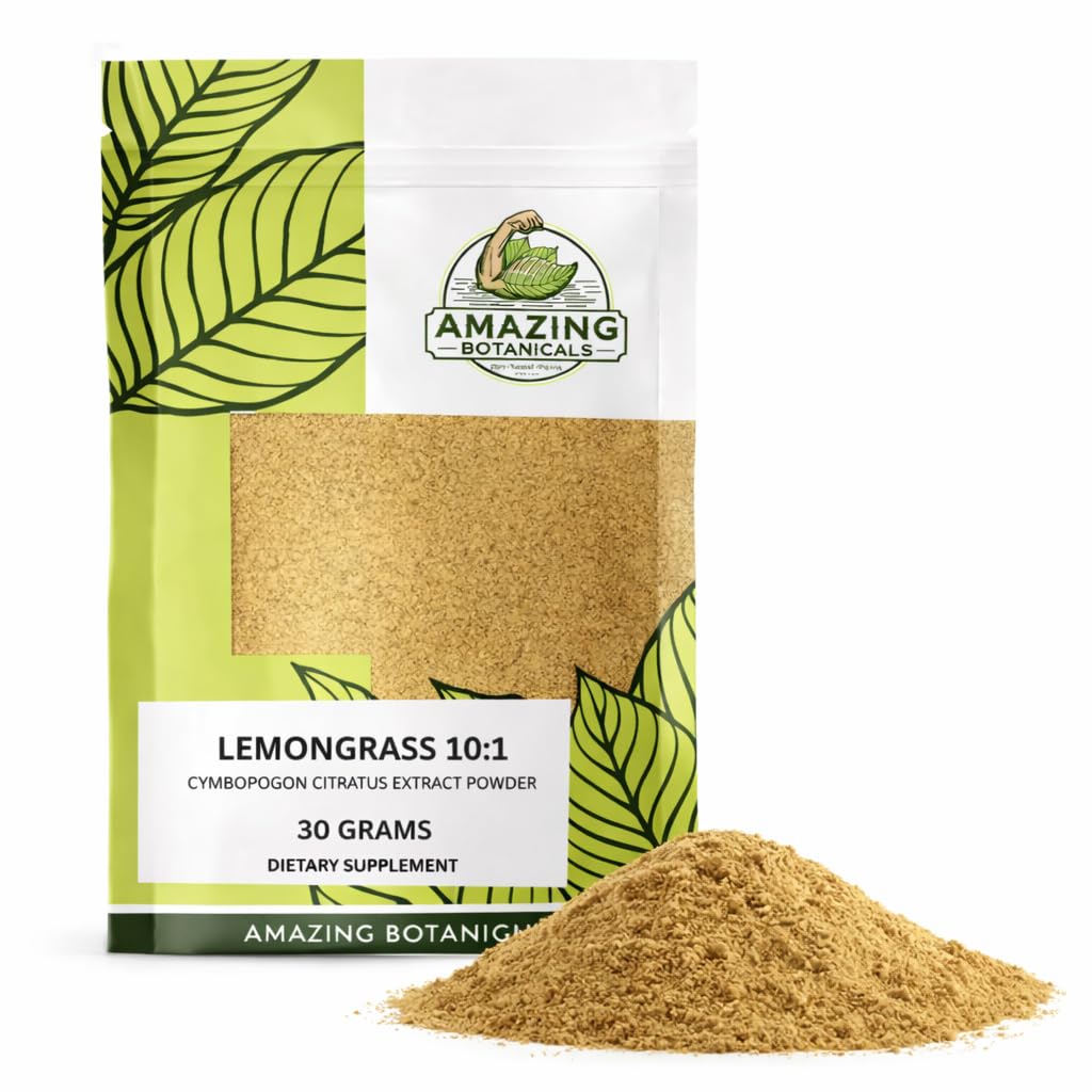 Amazing Botanicals Lemongrass Extract Powder 10:1 is carefully crafted from Cymbopogon citratus and concentrated to provide a reliable botanical ingredient in a convenient powder form. Naturally sourced and thoughtfully processed, this extract is designed for those seeking clean, simple ingredients without unnecessary additives. With its fine texture and neutral versatility, lemongrass extract powder can be easily incorporated into beverages, culinary applications, or personal formulations. As with all Amazing Botanicals products, quality and transparency are at the core of every batch. Supplement Facts Serving Size: 100mg Ingredient: Lemongrass Extract Powder (Cymbopogon citratus) 10:1 Other Ingredients: No Added Fillers or Preservatives Suggested Use Mix desired amount into water, tea, smoothies, or recipes. Adjust usage based on personal preference. Store in a cool, dry place. Legal Disclaimer This product is not intended to diagnose, treat, cure, or prevent any disease. Consult a healthcare professional before use if you are pregnant, nursing, taking medication, or have a medical condition.✓ Quality You Can Trust – Produced in small batches with attention to purity, consistency, and quality standards. Easy to Mix Versatile – Fine powder blends easily into teas, smoothies, recipes, or encapsulation formats. No Added Sugar, Non-GMO, Vegan – Clean formulation suitable for plant-based lifestyles and free from genetically modified ingredients. Pure, Single-Ingredient Formula – Contains only lemongrass extract powder with no fillers, artificial ingredients, or preservatives. Concentrated Lemongrass Extract 10:1 – Made from Cymbopogon citratus, this extract powder is concentrated at a 10:1 ratio for consistent botanical content.