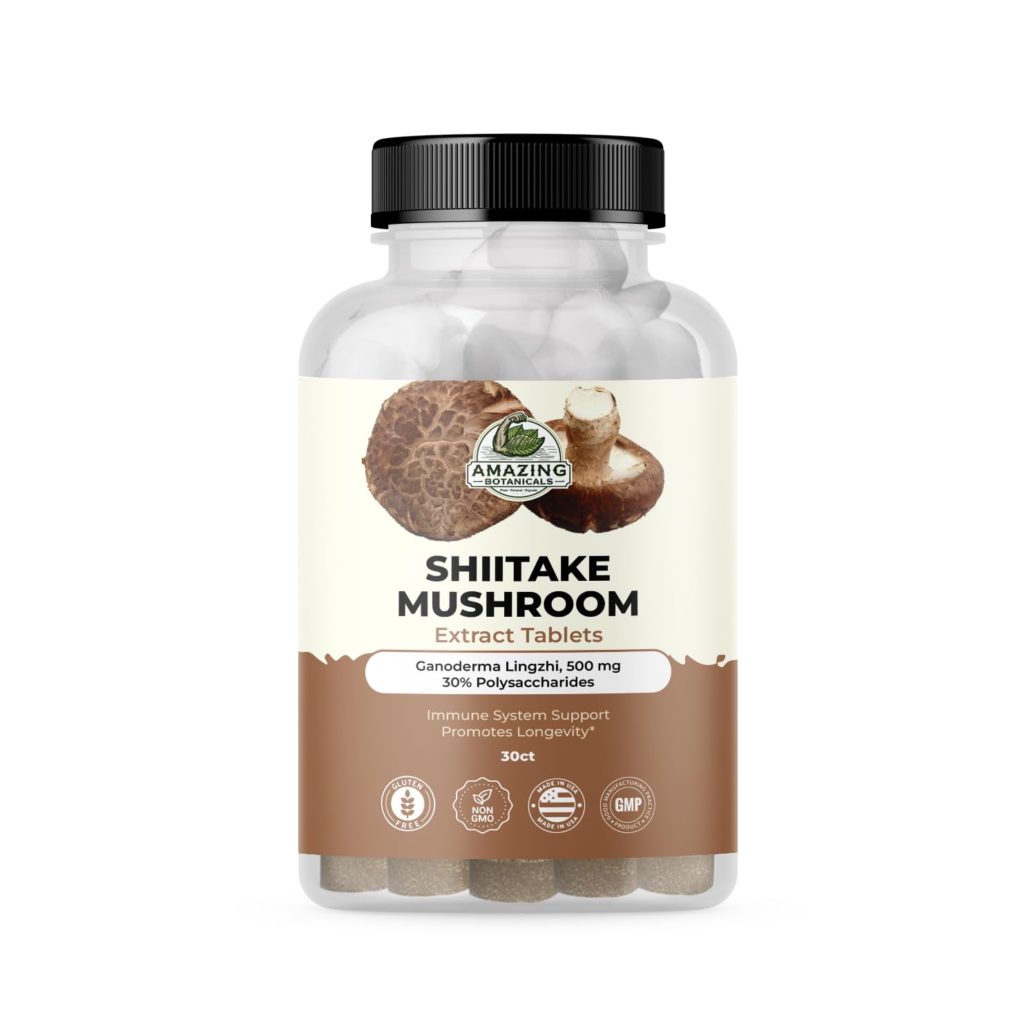 Amazing Botanicals Shiitake Mushroom 500mg Extract Tablets - 30% Polysaccharide - Natural Mushroom Complex for Overall Wellbeing - 30 Count
