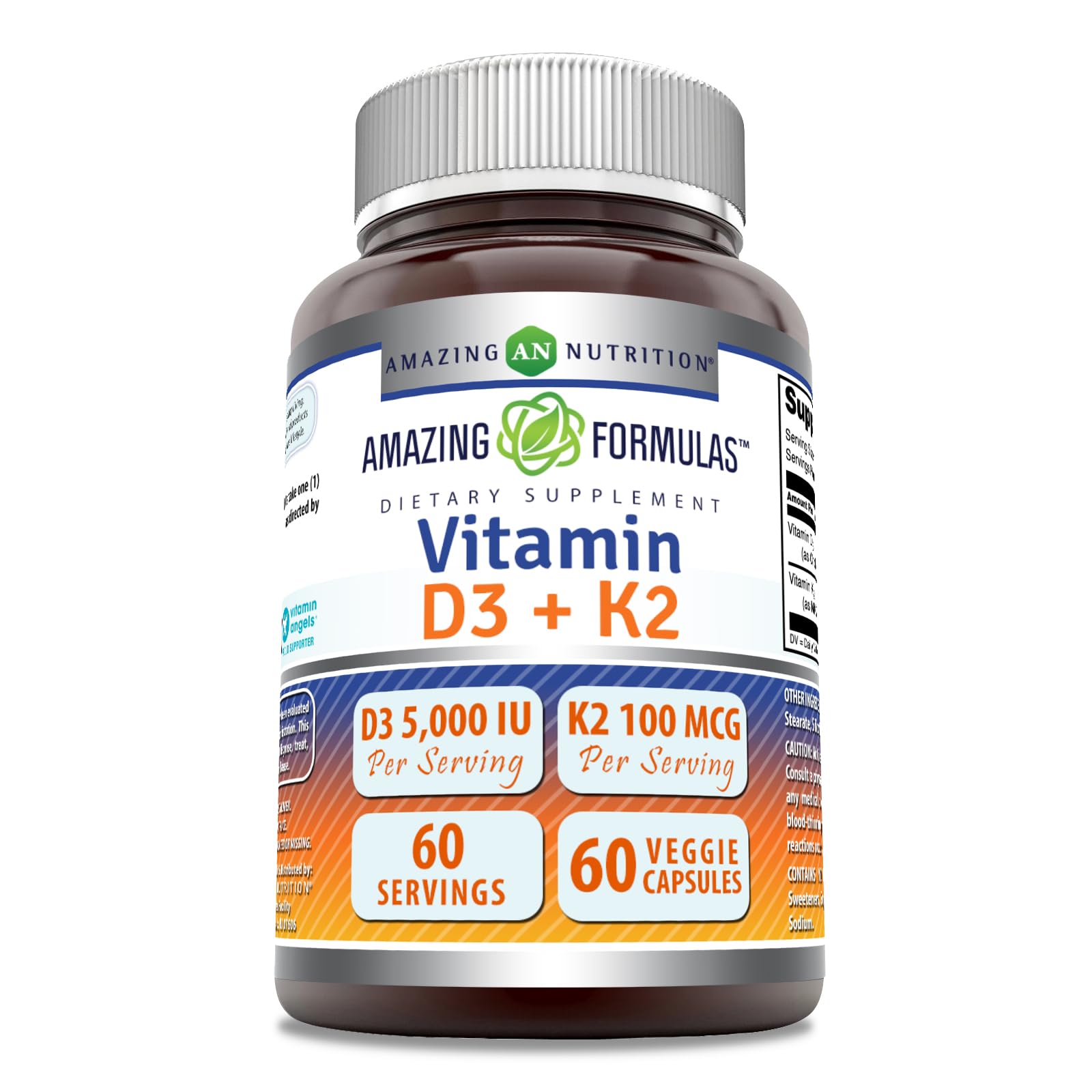 Amazing Formulas Vitamin D3 5000 IU with Vitamin K2 100 mcg | D3 + K2 Complex Supplement | Veggie Capsules | Non-GMO | Gluten Free | Made in USA (60 Count)