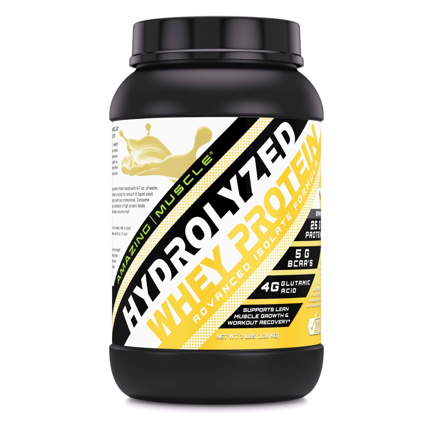 QUALITY, PURITY AND POTENCY All Amazing Muscle products are proudly made in USA at a GMP certified facility with Guaranteed Purity Potency. We offer best quality products for the best value. All our products are Third Party Tested. We do not compromise on quality. DELICIOUS EASY TO MIX You're sure to love the Banana flavor, and our protein powder is instantized so it mixes easily in water, milk, juice or your favorite beverage to make a smooth, tasty shake. THE BEST ADDITION TO YOUR DIET Hydrolyzed whey protein isolate is low in carbs, fat, sodium and cholesterol! And contain higher levels of leucine, cysteine and amino acids. Plus, it's sugar free, trans fat free and free of banned substances. COMPLETE ARRAY OF AMINO-ACIDS Along with an optimum dose of hydrolyzed protein isolate in every serving this supplement also offers a complete array of Amino acids including 5.3 grams of BCCAs (Branched chain amino acids), 4 grams of glutamic acid, all 8 Essential Amino Acids and more. A HIGH PERFORMANCE PROTEIN SUPPLEMENT Amazing Muscle Ultra Pure Hydrolyzed Whey Protein Isolate Gives You 25 Grams Of Protein Per Serving. Hydrolyzed Whey Protein Isolate is the most complete form of protein supplement with maximum protein.