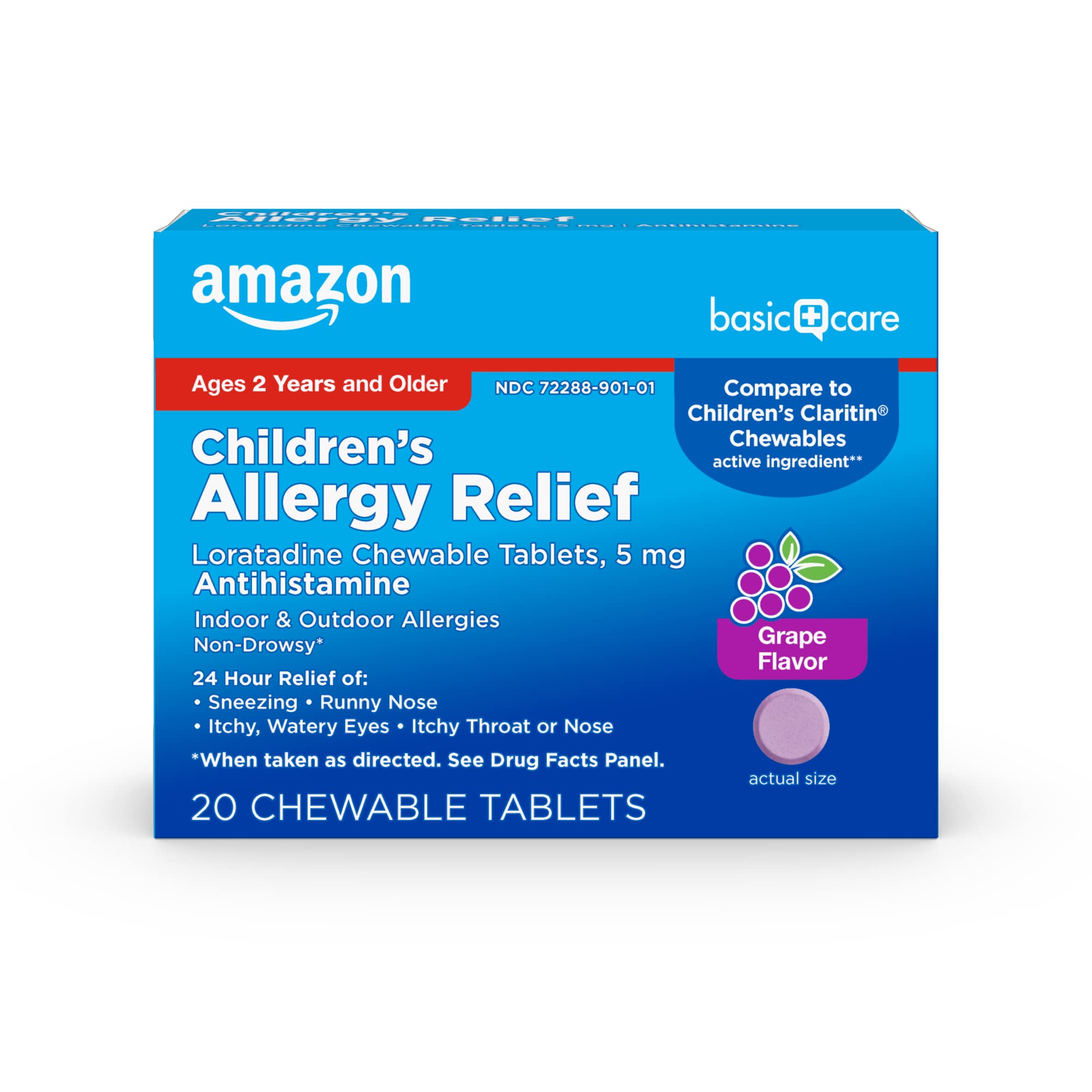 Amazon Basic Care Children's Allergy Relief, Loratadine Chewable Tablets, 5 mg, Grape Flavored, Ages 2 and up, 20 Count