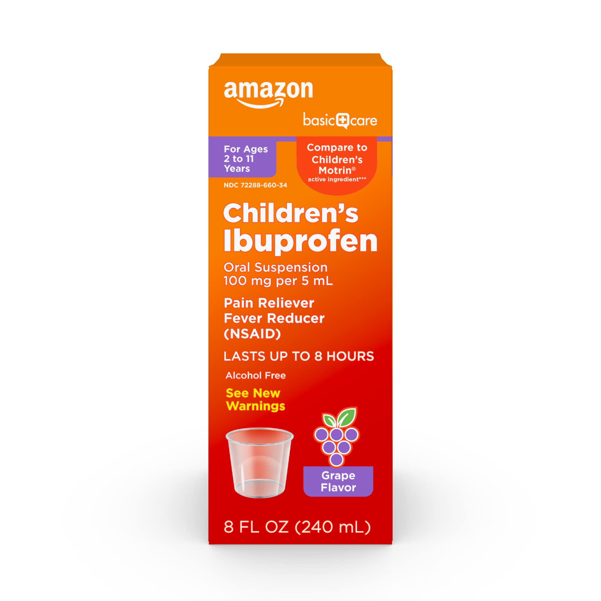 Amazon Basic Care Children's Ibuprofen Oral Suspension 100 mg per 5 mL, Pain Reliever and Fever Reducer, Grape Flavor, For Minor Aches, Sore Throat, Headache Relief and More, 8 fl oz (Pack of 1)