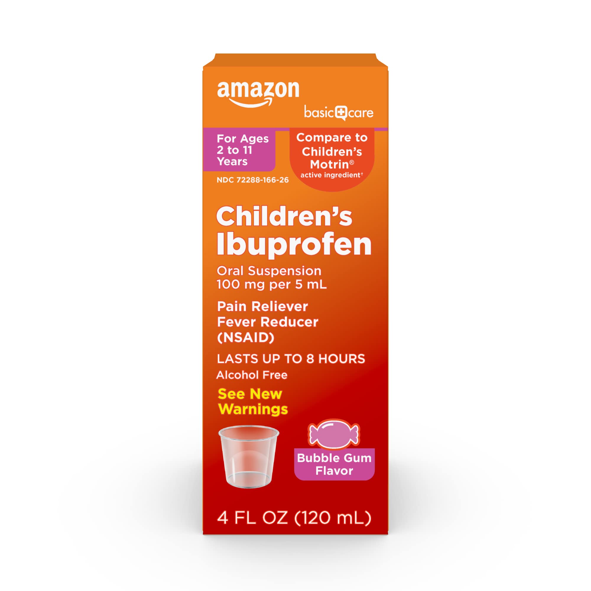 GLUTEN FREE: This children's pain reliever and fever reducer is gluten free and contains no alcohol. CHILD-RESISTANT: Features a child-resistant safety cap dosage cup included. MADE FOR CHILDREN: Bubble Gum flavor is a kid-friendly choice for children ages 2 to 11 years. 8-HOUR RELIEF: This NSAID (nonsteroidal anti-inflammatory drug) reduces fever and relieves minor aches and pain for up to 8 hours. ACTIVE INGREDIENT: Basic Care Children's Ibuprofen Oral Suspension contains 100 mg per 5 mL of ibuprofen, which is a pain reliever and fever reducer compare to the active ingredient of Children's Motrin.