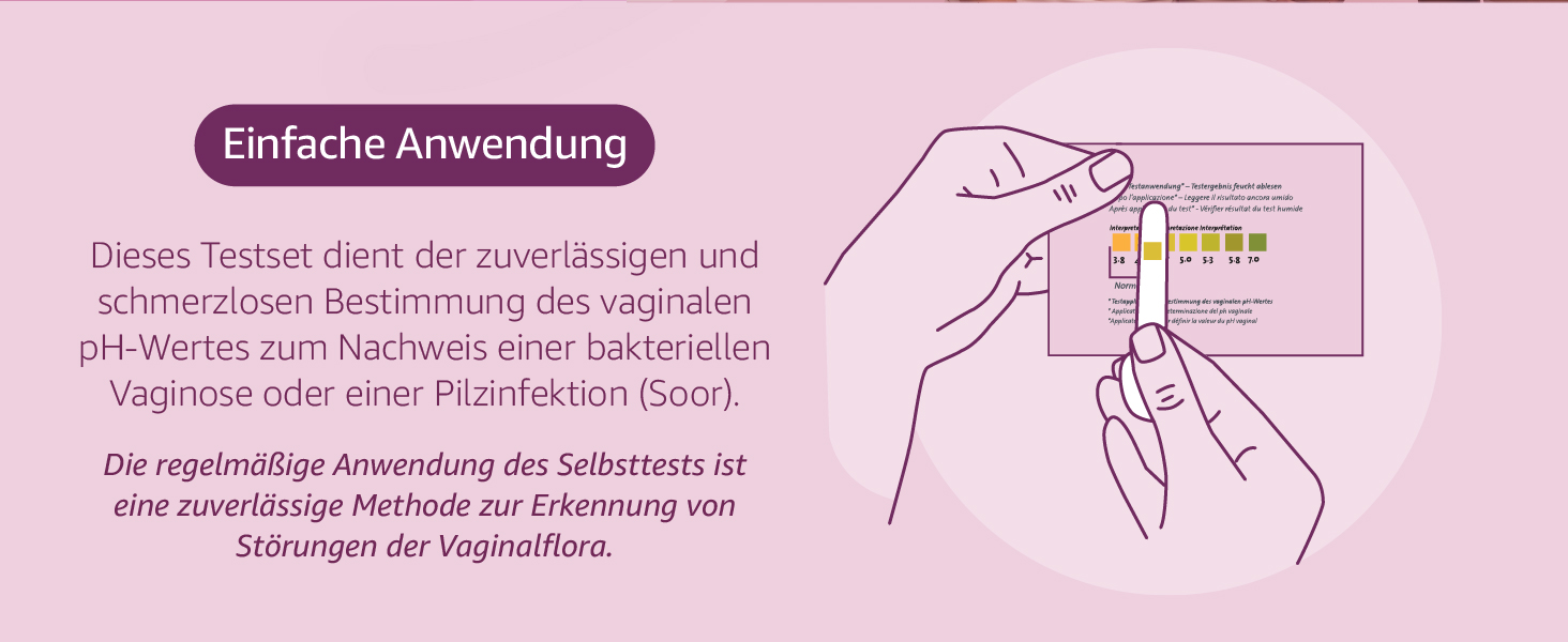 [email protected]Bitte lesen Sie die beiliegende Gebrauchsinformation, bevor Sie das Produkt verwenden. Mit diesem Test sind 100,0 % der Frauen in der Lage, den pH-Wert ihrer Vagina selbst zu bestimmen, und 96,8 % der Frauen haben den richtigen pH-Wert gefunden. Ein pH-Wert von 4,5 ist für das einwandfreie Funktionieren des natürlichen Schutzsystems der Vagina unerlässlich. Eine zuverlässige und schmerzfreie Methode zur Bestimmung des vaginalen pH-Wertes. Unmittelbare Ergebnisse. Einfach zu verwenden und zu verstehen. Hilft bei der Diagnose der 3 häufigsten Vaginalinfektionen: bakterielle Vaginose, Trichomoniasis und Soor. 3er Pack.