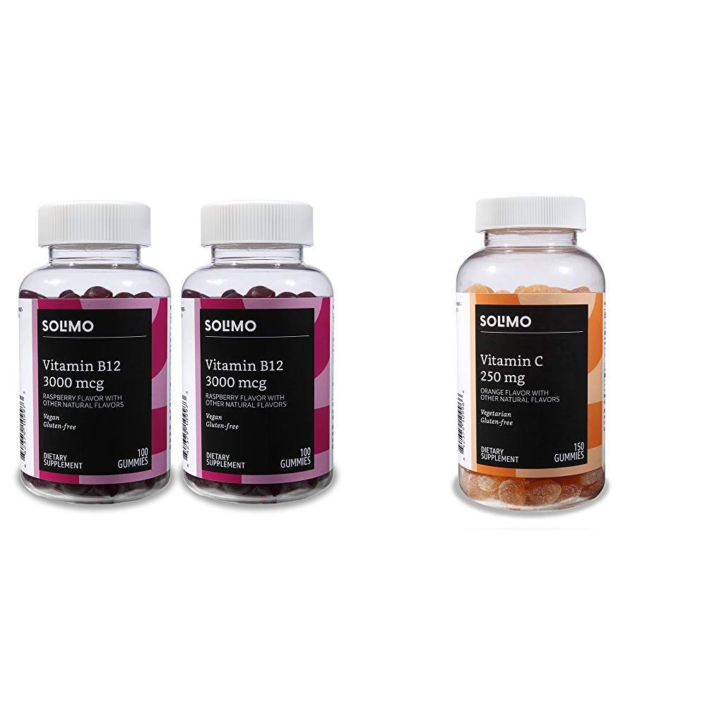 Brand - Solimo Vitamin B12 3000 mcg - Normal Energy Production and Metabolism, Immune System Support - 100 Gummies, Pack of 2 (2 Gummies per serving) Supports energy production by converting food to fuel and is essential for red blood cell formation. Promotes energy metabolism. Supports normal brain function and cognition. Supports healthy immune function. Solimo Vitamin B12 gummies feature raspberry flavor with other natural flavors. They're vegan and gluten-free. Adults - chew two daily. Brand - Solimo Vitamin C 250mg, 150 Gummies (2 Gummies per Serving) Solimo Vitamin C gummies feature sour orange flavor with other natural flavors. They're vegetarian and gluten-free. Adults - chew two daily.