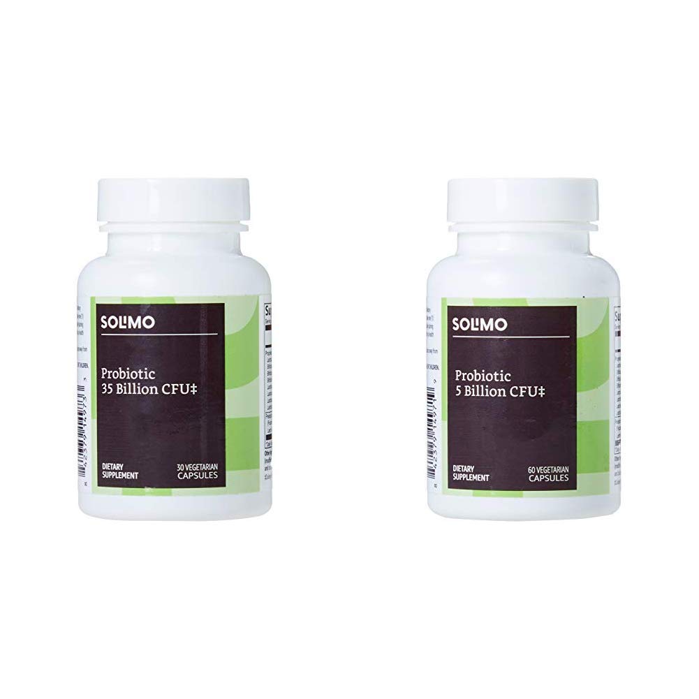 Brand - Solimo Probiotic 35 Billion CFU, 8 Probiotic Strains with Prebiotic Blend, 30 Vegetarian Capsules, 1 Month Supply Solimo Probiotic vegetarian capsules for women and men feature 35 billion CFU proprietary probioitic with 50mg prebiotic blend per capsule. As a dietary supplement, adults take one capsule daily during meals or as directed by a health care professional. Store in a cool, dry place away from direct sunlight. Brand - Solimo Probiotic 5 Billion CFU, 8 Probiotic strains with 60 mg Prebiotic Blend, 60 Vegetarian Capsules, 2 Month Supply Solimo Probiotic vegetarian capsules feature a proprietary 8-strain probioitic blend with 60 mg prebiotic blend. As a dietary supplement, adults take one capsule daily during meals or as directed by a health care professional. Store in a cool, dry place away from direct sunlight.