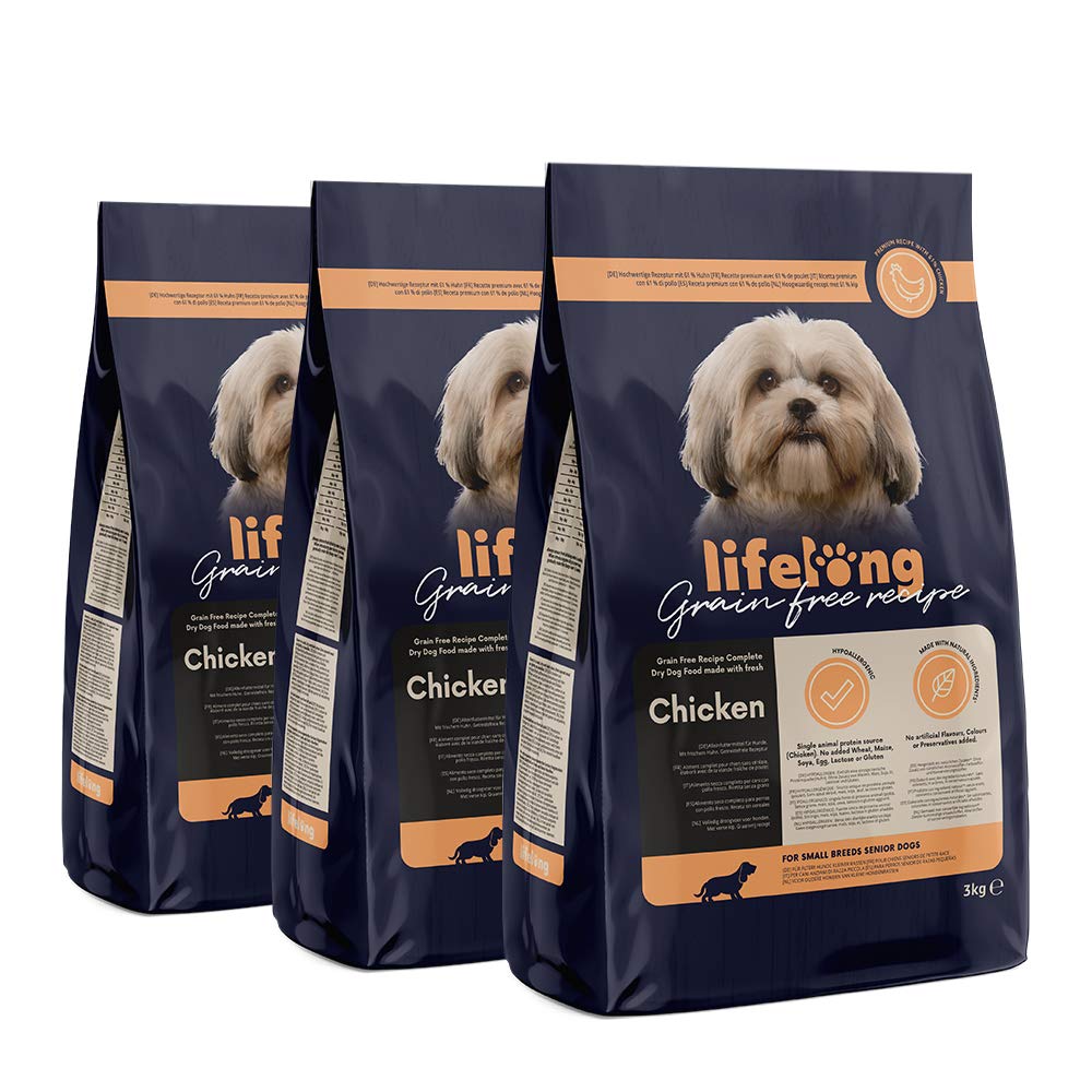 brand - Lifelong Complete grain-free food for small breed senior dogs made with fresh chicken meat - 3kg 3 INGREDIENTS Composition: Fresh chicken meat (40 ), pea starch , dehydrated chicken protein, pea protein , hydrolyzed animal protein (chicken), poultry fat, beet pulp, minerals, pea bran , fructo-oligosaccharides (FOS), fish oil, algae meal (source of DHA), dehydrated marigold flower (0.1 ), yeast cell walls (source of mannan-oligosaccharides (MOS)), dehydrated aromatic plants (0.05 ) (thyme , basil , ginger , agrimony , rosemary ), glucosamine (animal origin) (0.045 ), chondroitin sulfate (0.038 ), yucca schidigera, dehydrated apple (0.03 ), dehydrated tomato (0.03 ), dehydrated carrot (0.03 ), extract citrus (0.03 ) (grapefruit, orange, tangerine, bergamot). Natural ingredients Additives per kg: Nutritional additives: Vitamin A 24500 IU, Taurine 1448 mg, Vitamin D3 1280 IU, Vitamin E 390 mg, L-Carnitine 200mg, Vitamin C 167 mg, Fe (Iron (II) sulfate monohydrate) 100 mg, Zn (Zinc and amino acid chelate hydrate) 100 mg, Mn (Manganese sulfate monohydrate) 40 mg, Biotin 11 mg, Cu (Copper (II) sulfate pentahydrate) 11 mg, I (Anhydrous calcium iodate) 2.2 mg, Se (Sodium selenite) 0.1 mg. Analytical constituents: Protein 30 , Fat content 13 , Crude fiber 3.6 , Inorganic matter 7 .Veterinarian Verified: Developed by pet nutritionists and vet-verified. Healthy Coat Skin: Biotin and zinc to maintain a healthy coat and skin. Fresh Deboned Chicken: Made with fresh, deboned chicken. Eye Heart Health: Taurine and marigold flower for eye and heart health. Joint Function: Glucosamine and chondroitin for healthy joint function. Digestive Aid: With a selection of natural herbs to aid digestion. Made with Natural Ingredients : No added colors, flavors, or preservatives. Natural Antioxidants: With fruits and vegetables, a source of natural antioxidants. Hypoallergenic: Single source of animal protein (chicken). No added wheat, corn, soy, egg, lactose, or gluten. Complete food for puppies. Premium recipe with 61 chicken. Marque - Lifelong Aliment complet pour chiens seniors de petite race sans céréale élaboré avec de la viande fraîche de poulet - 3kg 3 INGRÉDIENTS Composition : Viande de poulet fraîche (40 ), amidon de pois , protéine de poulet déshydraté, protéine de pois , protéine animale hydrolysée (poulet), matières grasses de volaille, pulpe de betterave, substances minérales, son de pois , fructo-oligosaccharides (FOS), huile de poisson, farine d'algue (source de DHA), fleur de souci déshydratée (0,1 ), parois cellulaires de levure (source de mannan-oligosaccharides (MOS)), plantes aromatiques déshydratées (0,05 ) (thym , basilic , gingembre , aigremoine , romarin ), glucosamine (origine animale) (0,045 ), sulfate de chondroïtine (0,038 ), yucca schidigera, pomme déshydratée (0,03 ), tomate déshydratée (0,03 ), carotte déshydratée (0,03 ), extrait d'agrume (0,03 ) (pamplemousse, orange, tangerine, bergamote). Ingrédients naturels Additifs par kg : Additifs nutritionnels : Vitamine A 24500 UI, Taurine 1448 mg, Vitamine D3 1280 UI, Vitamine E 390 mg, L-Carnitine 200mg, Vitamine C 167 mg, Fe (Sulfate de fer (II) monohydraté) 100 mg, Zn (Chélate de zinc et d'acides aminés hydraté) 100 mg, Mn (Sulfate de manganese monohydraté) 40 mg, Biotine 11 mg, Cu (Sulfate de cuivre (II) pentahydraté) 11 mg, I (Iodate de calcium anhydre) 2,2 mg, Se (Sélénite de sodium) 0,1 mg. Constituants analytiques : Protéine 30 , Teneur en matières grasses 13 , Cellulose brute 3,6 , Matière inorganique 7 .Vérifié par des vétérinaires : Développé par des nutritionnistes pour animaux et vérifié par des vétérinaires. Pelage et peau en pleine santé : Biotine et zinc pour maintenir un pelage et une peau en pleine santé. Poulet frais désossé : Élaboré avec de la viande fraîche et désossée de poulet. Santé des yeux et du cœur : Taurine et fleur de souci pour la santé des yeux et du cœur. Fonctionnement des articulations : Glucosamine et chondroïtine pour le bon fonctionnement des articulations. Aide à la digestion : Avec une sélection de plantes aromatiques naturelles pour faciliter la digestion. Elaboré avec des ingrédients naturels : Sans colorants, ni arômes, ni conservateurs ajoutés Antioxydants naturels : Avec des fruits et des légumes, source d'antioxydants naturels. Hypoallergénique : Source unique de protéine animale (poulet). Sans ajout de blé, maïs, soja, œuf, lactose ni gluten. Aliment complet pour chiots. Recette premium avec 61 de poulet.