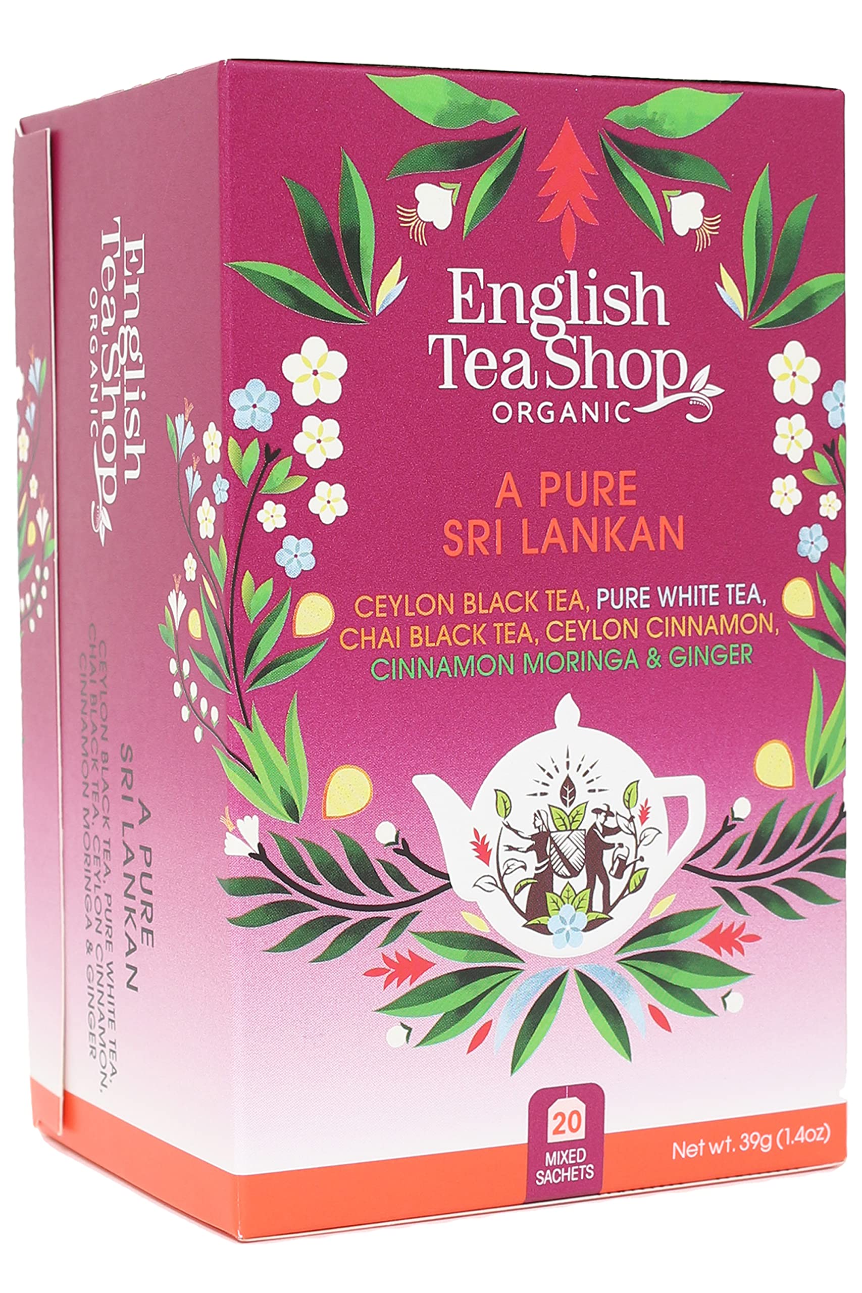 Discover the authentic flavors of Sri Lanka with the English Tea Shop A Pure Sri Lankan tea variety box containing 20 bags of five different tea flavors. From classic Ceylon Black Tea, Pure White Tea and Black Chai to Ceylon Cinnamon and Cinnamon, Moringa and Ginger, explore the delicious flavors of Sri Lanka in every cup and experience an enriching selection of teas full of natural goodness. Each box is beautifully presented and makes a wonderful gift for tea lovers or use to make your own tea basket, suitable for any occasion. In this variety box you will find: 2 x Cinnamon, Moringa Ginger: A bright mix of cinnamon, moringa and ginger 2 x Ceylon Black Tea: Classic Ceylon black tea 2 x Pure White Tea: Just pure white tea 2 x Chai Black Tea: A delicious mix of black tea, ginger, cinnamon, turmeric, cardamom, close, nutmeg, black pepper and mace 2 x Ceylon Cinnamon: A warm mix of cinnamon, ginger and cardamom English Tea Shop offers a wide range of family favorite blends to adventurous tastes, available in individual tea bags, loose-leaf varieties or gift boxes - you're sure to find something to suit every taste and occasion. Welcome to the English Tea Shop your tea-loving community. A Sri Lankan tea story infused with British traditions. From the rich and robust to the delicate and fragrant, every cup of English Tea Shop tea celebrates our vibrant community and heartfelt commitment to sustainability. As friends of Mother Nature, we've worked hard to ensure our process and packaging is planet-friendly. Our tea bag boxes contain staple-free and fully compostable tea bags to reduce waste with inner and outer packaging that is also fully compostable. We further reduce our ecological footprint by hand-packing all our tea. From there it's a hop, skip and jump over the sea and around the world right into your teacup. We care deeply about the way our tea is grown and harvested. English Tea Shop tea is made with only the finest organic ingredients and works with Fairtrade farmers, blenders and producers to deliver exceptional tea for you to enjoy at home. Our teas and ingredients come from smallholder farmers in limited quantities, grown without chemical fertilizers or pesticides. INGREDIENTS Ceylon black tea: organic Ceylon black tea. Ingredients: organic black tea (100 ). Pure white tea: organic white tea. Ingredients: organic white tea (100 ). Chai black tea: organic black tea with ginger, cinnamon, turmeric, cardamom, cloves, nutmeg, pepper and mace. Ingredients: organic black tea (33 ), organic ginger (18 ), organic cinnamon (13 ), organic turmeric (7 ), organic cardamom (7 ), organic cloves (7 ), organic nutmeg (6 ), organic black pepper (5 ), organic club (4 ). Ceylon cinnamon: organic herbal tea with cinnamon, ginger and cardamom, Ingredients: organic cinnamon (90 ), organic ginger (6 ), organic cardamom (4 ). Cinnamon Moringa ginger: organic herbal tea with cinnamon, moringa and ginger. Ingredients: organic cinnamon (61 ), organic moringa (26 ), organic ginger (13 ). INSTRUCTIONS FOR USE Ceylon black tea: 4-5 minutes (100ºC) pure white tea: 2-3 minutes (80ºC) Chai black tea: 3-5 minutes (100ºC) Ceylon cinnamon: 3-5 minutes (100ºC) Cinnamon Moringa Ginger: 3-5 minutes (100ºC) SAFETY WARNING Do not expose to direct sunlight See moreEnglish Tea Shop Een pure Sri Lankan, 20 Fairtrade biologische theezakjes, 5 authentieke Sri Lankaanse theesmaak Ontdek de authentieke smaken van Sri Lanka met de Engelse Tea Shop Een Pure Sri Lankaanse theevariëteit doos met 20 zakjes van vijf verschillende theesmaken. Van klassieke Ceylon Black Tea, Pure White Tea en Black Chai tot Ceylon Kaneel en Kaneel, Moringa en Gember, verken de heerlijke smaken van Sri Lanka in elke beker en ervaar een verrijkende selectie thee vol natuurlijke goedheid. Elke doos is prachtig gepresenteerd en is een prachtig cadeau voor theeliefhebbers of gebruik om je eigen theemand te maken, geschikt voor elke gelegenheid. In deze variëteit doos vindt u: 2 x Kaneel, Moringa Gember: Een heldere mix van kaneel, moringa en gember 2 x Ceylon Zwarte Thee: Klassieke Ceylon zwarte thee 2 x Pure Witte Thee: Gewoon pure witte thee 2 x Chai Black Thee: Een heerlijke mix van zwarte thee, gember, kaneel, kurkuma, kardemom, close, nootmuskaat, zwarte peper en foelie 2 x Ceylon Kaneel: Een warme mix van kaneel, gember en kardemom English Tea Shop biedt een breed scala aan favoriete mixen van familie aan avontuurlijke smaken, verkrijgbaar in individuele theezakjes, losbladige variëteiten of geschenkdozen - u zult zeker iets vinden dat bij elk wat wils en gelegenheden past. Welkom bij de Engelse theewinkel uw thee-liefhebbende gemeenschap. Een Sri Lankaans theeverhaal doordrenkt met Britse tradities. Van de rijke en robuuste tot de delicate en geurige, elke kop Engelse Tea Shop thee viert onze levendige gemeenschap en oprechte toewijding aan duurzaamheid. Als vrienden van Moeder Natuur, we hebben hard gewerkt om ervoor te zorgen dat ons proces en onze verpakking planeetvriendelijk is. Onze theezakdozen bevatten nietvrije en volledig composteerbare theezakjes om afval te verminderen met binnen- en buitenverpakking die ook volledig composteerbaar is. We verkleinen onze ecologische voetafdruk verder door al onze thee met de hand in te pakken. Vanaf daar is het een hop, sla over en spring over de zee en over de hele wereld recht in je theekopje. We geven veel om de manier waarop onze thee wordt gekweekt en geoogst. English Tea Shop thee is gemaakt met alleen de beste biologische ingrediënten en werkt samen met Fairtrade boeren, blenders en producenten om uitzonderlijke thee te leveren waar u thuis van kunt genieten. Onze thee en ingrediënten zijn afkomstig van kleine boeren in beperkte hoeveelheden, geteeld zonder chemische meststoffen of pesticiden. INGREDIËNTEN Ceylon zwarte thee: biologische Ceylon zwarte thee. Ingrediënten: biologische zwarte thee (100 ). Pure witte thee: biologische witte thee. Ingrediënten: biologische witte thee (100 )