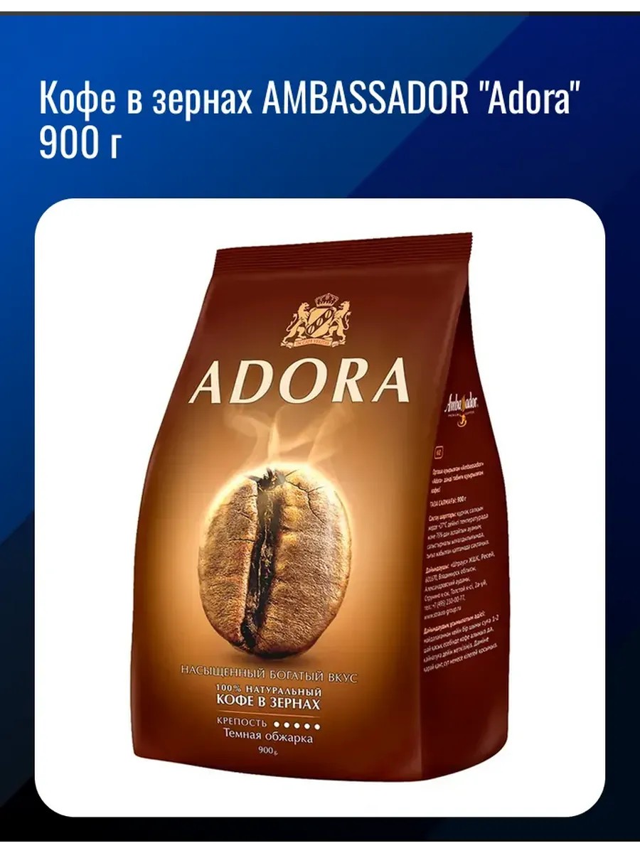 Number of packages: 1 pc., Quantity per package: 1 pc., AMBASSADOR "Adora" coffee is made from selected Arabica beans. This is an ideal blend that has an exquisite soft taste with a characteristic acidity, a long aftertaste, and a unique, sophisticated aroma. Created for those who appreciate impeccable quality and richness of taste. AMBASSADOR "Adora" is an excellent drink for daily consumption. Suitable for both espresso and milk-based drinks. Naturally roasted whole bean coffee. 100% Arabica. Flavor intensity - Strong. Roasting level - Dark. Nutritional value of the product: Energy value, kcal/100 g - 92. Coffee preparation method: in a cup, geyser coffee maker, drip coffee maker, coffee machine, filter coffee, horn coffee maker, Turk, French press, pod coffee maker. Net weight: 900 g; Roasting level: dark; Bean variety: 100% Arabica; Coffee type: whole bean; Shelf life: 18 months; Taste: Adora; Series: Adora; Manufacturer: Strauss LLC; Packaging: vacuum bag