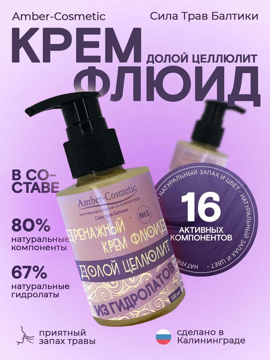 Дренажный крем-флюид на основе гидролатов для лица и тела "Долой целллит". Состоит из 16 активных компонентов. Удовольствие для лица и тела. Натуральный цвет и запах. Состоит более, чем из 80% натуральных компонентов. 67% в составе крем- гидролаты. Инновация в мире косметики. Не содержит искуственных ароматизаторов. Обратите вимание - запах натуральной травы!! Легкий, не жирный, хорошо впитывается кожей и не оставляет следов. Аромат окутывает все тело спустя некоторое время. Выраженный эффект по снижению застоя воды в коже, как следствие - дренирующий эффект и уменьшение оббъемов тела. Быстро заживляет мелкие повреждения. Тонизирует. Лучше применять в первой половине дня. Перед сном не рекомендуем. Для лица - нанесите на область под глазами, если есть отеки и обязательно на область лимфатических узлов (боковые поверхности лица), шею (платизма) массажными движениями от центра вбок и вниз не сильно надавливая, поглаживая и постукивая пальцами. Дождитесь впитывания. Для тела: нанесите массажными движениями вверх по телу до талии и от шеи к талии. Сосредоточьтесь в области накопления "жира", хотя бы слегка проработайте их. После впитывания используйте массажную рукавицу или другие массажеры. Используется для сухого массажа без масла. Может использоваться для обертывания, солевых компрессов (под компресс), прессотерапии и манипуляций классического массажа (масло) после проверки на совмесимость компонентов. Годится для LPG, наносить под костюм для LPG до полного впитывания крема, или же наносить крем сразу после снятия костюма. Сделано в Калининграде. 100 мл. Упакован в тюбик с клювовым дозатором.