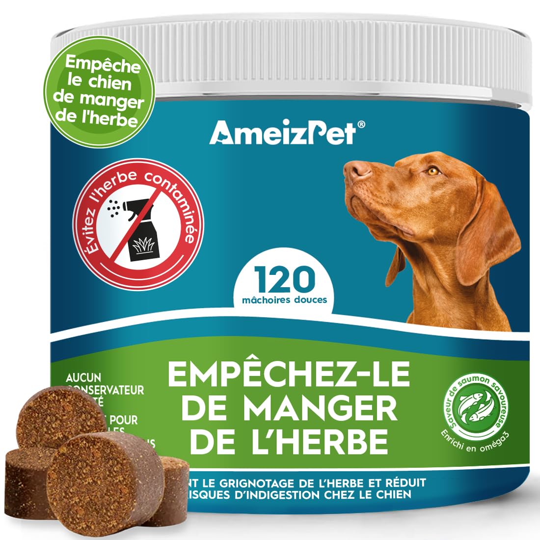 AmeizPet Dog Grass Deterrent Stops Dogs From Eating Grass Soothes Stomach & Reduces Heartburn Digestive Enzymes 120 Treats 270g (9.5 Oz)