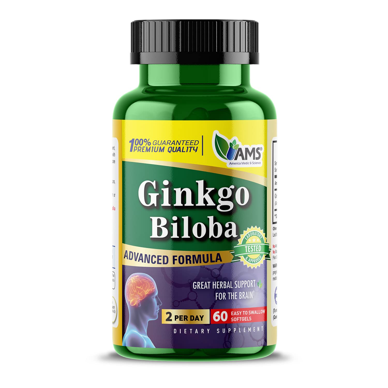 PART OF A HEALTHY DAILY REGIMEN: Together with a balanced diet and a sensible exercise plan, regular use of Ginkgo Biloba can enhance your brain functions and cognitive well-being. SUPPORTS CONCENTRATION AND FOCUS: Our supplement may enhance your natural capacity to maintain attention on important matters. You can get more things done without distraction. PROMOTES SHARP MEMORY: It's crucial to remember important things exactly when you need to. With a sharper memory, you can elevate the way you live your life with perspective and wisdom. HELPS ENHANCE MENTAL CLARITY: Regular intake can help you maintain mental proficiency throughout your day. You may be able to feel more confident in your faculties and better able to face challenges. ADVANCED BRAIN BOOSTER: America Medic Science Ginkgo Biloba 60mg is a dietary supplement for men and women. It is formulated to help enhance your cognitive functions and support brain health.