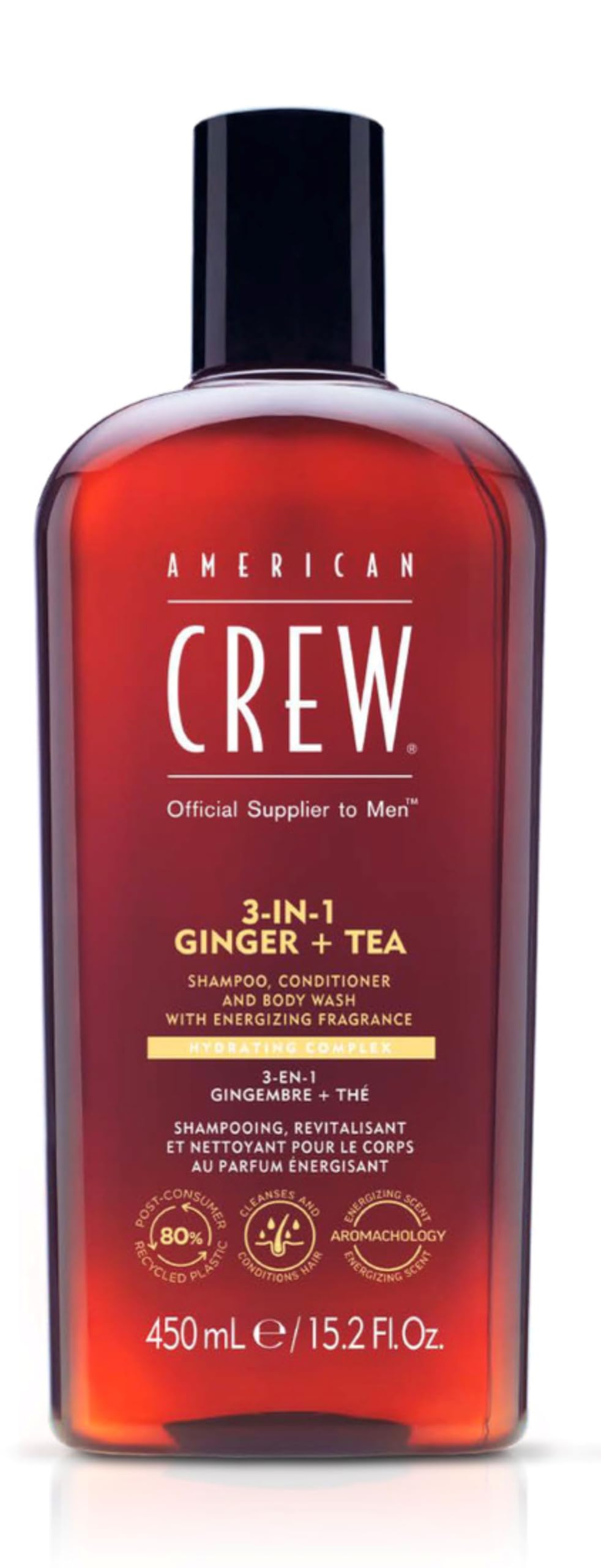 EXPECTED RESULTS: Simplify your hair and body care routine with our American Crew Ginger Tea 3-in-1 Shampoo and Body Wash for optimal results. The body wash and shampoo intensely moisturize and deeply nourish the skin. This men's hair and body care product makes styling easier, leaves a fresh, masculine scent, and ensures healthy-looking hair from the first use. DIRECTIONS FOR USE: This moisturizing American Crew shampoo and body wash is intended for daily use. The repairing and moisturizing shampoo provides a complete grooming experience. Apply the shampoo and body wash to wet hair and body. Gently massage. Rinse thoroughly. FORMULA WITH VITAMIN B5 AND NOURISHING ACTIVES: American Crew's 3-in-1 shampoo and body wash is enriched with vitamin B5 for hydration, promoting stronger hair. The shampoo's salicylic acid purifies the skin and scalp. Jojoba oil helps protect the skin's natural moisture barrier while softening it. The formula is vegan and suitable for sensitive skin. REVITALIZING AND SOOTHING ALL-IN-ONE CARE: American Crew's 3-in-1 Shampoo provides an invigorating cleanse, revitalizes, and deeply moisturizes the skin. The shampoo and conditioner keep hair healthy, stimulate the scalp, and make detangling easier. The body wash restores and revitalizes the skin with deep hydration. AMERICAN CREW 3-IN-1 SHAMPOO: American Crew's 3-in-1 Shampoo combines the functions of shampoo, conditioner, and body wash in one formula. This hair and body care product removes impurities and excess oil while toning hair and skin. Ideal for those seeking a simple and effective solution for their personal care routine. This American Crew multi-purpose hair and body care product is designed for daily use, offering a complete grooming experience. Apply the shampoo and body wash to wet hair and body. Gently massage. Rinse thoroughly.RÉSULTATS ATTENDUS: Simplifiez votre routine de soins capillaires et corporels avec notre shampoing 3 en 1 d'American Crew au Gingembre et Thé garantissant des résultats optimaux. Le gel douche et le shampoing hydrate intensément et nourrit la peau en profondeur. Ce soin cheveux et corps pour homme facilite le coiffage et laisse un parfum frais et masculin et garantit des cheveux sains dès la première application. CONSEILS D'UTILISATION : Ce shampoing hydratant American Crew est destiné à un usage quotidien. Le shampooing réparateur et hydratant offre une expérience de toilettage complète. Appliquer le shampoing et le gel douche sur cheveux et corps mouillés. Massez doucement. Rincer abondamment. FORMULE VITAMINE B5 ET ACTIFS NOURISSANTS: Le shampoing 3 en 1 d'American Crew est enrichi en vitamine B5 pour l'hydratation, favorisant la fortification des cheveux. L'acide salicylique du shampooing purifie la peau et le cuir chevelu. L'huile de jojoba aide à protège la barrarière d'hydration naturelle tout en adoucissant la peau. La formule est vegan et convient aux peaux sensibles. SOIN REVITALISANT ET APAISANT TOUT-EN-UN : Le shampoing 3 en 1 d'American Crew offre un nettoyage revigorant, revitalise et hydrate la peau en profondeur. Le shampooing et l'après-shampoing maintiennent les cheveux en plein forme, stimule le cuir chevelu et facilite le démêlage des cheveux. Le gel douche restaure et revitalise la peau avec une hydratation en profondeur. SHAMPOING 3 EN 1 AMERICAN CREW : Le shampoing 3 en 1 d'American Crew combine les fonctions de shampooing, d'après-shampoing et de gel douche en une seule formule. Ce soin cheveux et corps élimine les impuretés et l'excès de sebum tout en tonifiant la chevelure et la peau. Idéal pour les personnes qui recherchent une solution simple et efficace pour leur routine de soin personnel. Ce soin cheveux et corps multifonction American Crew est destiné à un usage quotidien offrant une expérience de toilettage complète. Appliquer le shampoing et le gel douche sur cheveux et corps mouillés. Massez doucement. Rincer abondamment.American Crew 3-En-1 Shampooing, Après Shampooing Gel Douche pour Cheveux et Corps Gingembre et Thé 450 ml (Lot de 1)