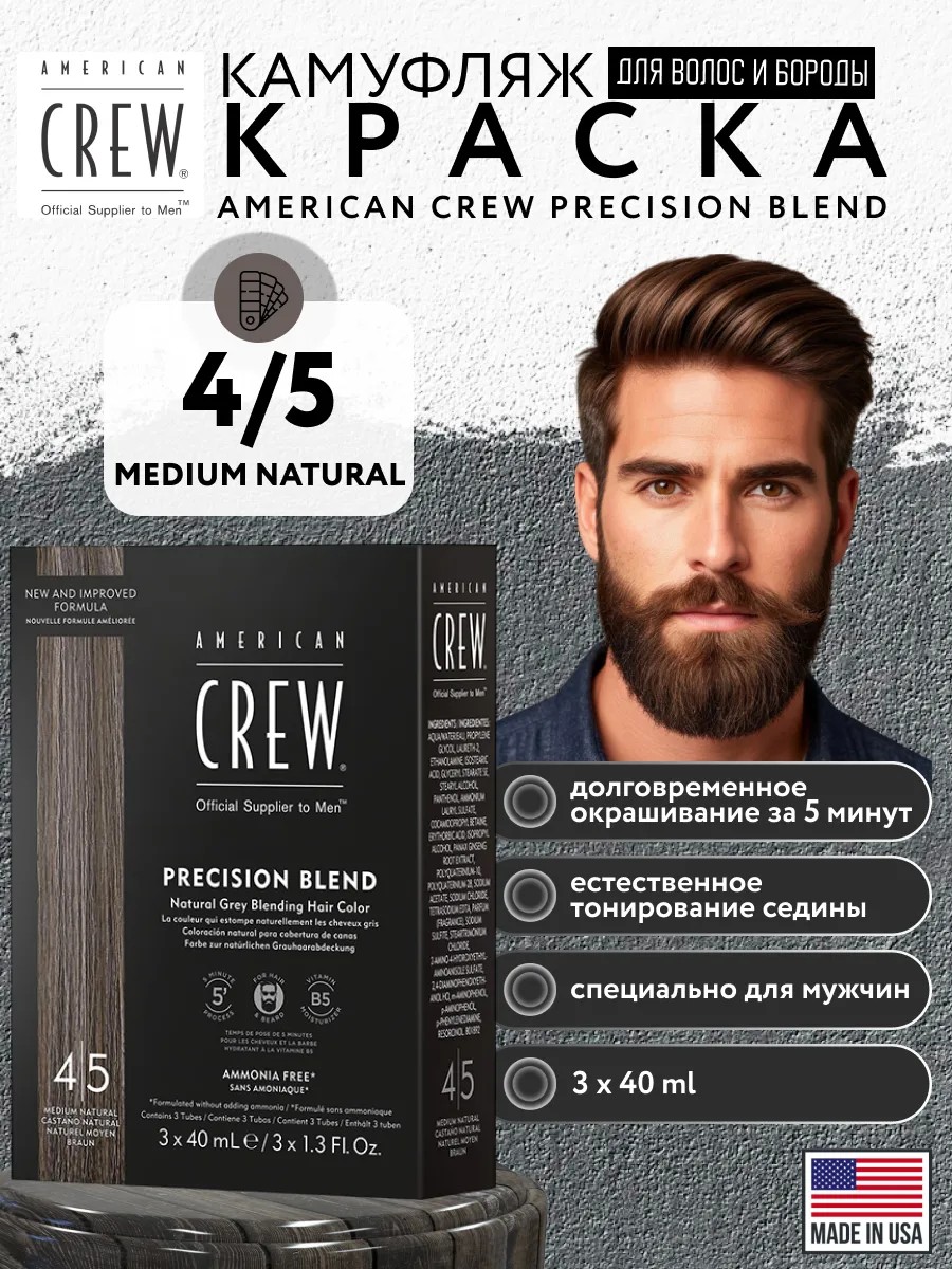 Камуфляж краска для волос и бороды AMERICAN CREW 4/5 цвет натуральный тонирующий эффект 120 мл. Мы представляем инновационный продукт специально для мужчин American Crew Камуфляж седины. Тонирующая краска для волос камуфляж обеспечивает более холодные оттенки и увлажняющие свойства благодаря витамину В5, а состав без аммиака подходит теперь не только для волос, но и бороды и даже для бровей. Разработан специально для быстрого и естественного тонирования седины у мужчин. Для профессионального и домашнего использования. Природный оттенок волос не изменяется. Мягко тонируется седина, становится менее выраженной, уходит желтизна. Отсутствие следов краски на коже головы как при обычном окрашивании. Минимальное время выдержки при окрашивании 5-7 минут. Одно окрашивание обеспечивает безупречный внешний вид мужчине на целых 6 недель. Для коротких волос одной краски хватит на 4-5 окрашиваний, а значит на срок более 4-х месяцев. К краске Американ Крю нужен Камуфляж оксид 4.5% в пропорции 1:1.