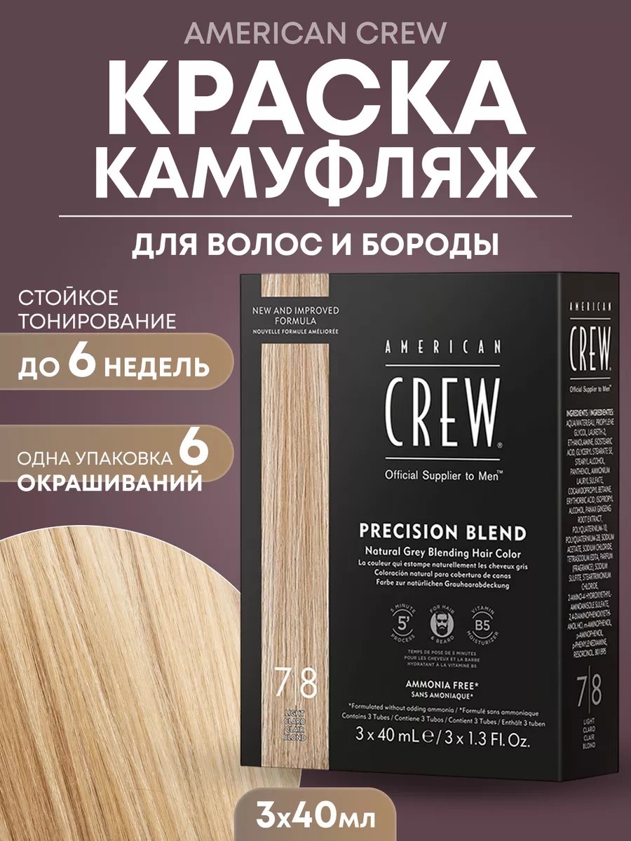 American Crew men's hair color allows you to conceal gray hair in just 5 minutes. Precision Blend 7/8 has a pleasant creamy texture and is easy and convenient to use. This camouflage color for gray hair allows you to achieve either light toning or full coverage, depending on the desired effect and tone. The ammonia-free formula is now suitable not only for hair, but also for beards and mustaches. Color lasts up to 6 weeks without regrowth. This professional cosmetic is specifically designed as a tinting camouflage color for men. One package is enough for 6 colorings. Mix with Precision Blend 4.5% bioactivator.