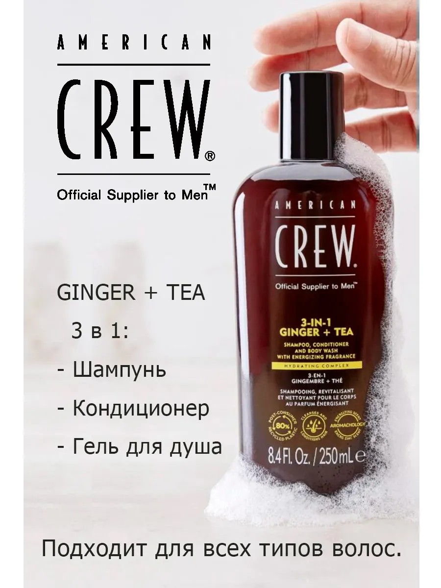 | Комплектация | American Crew GINGER + TEA 3 in 1 Шампунь, Кондиционер и Гель для душа Имбирь и зеленый чай 250 мл. |
