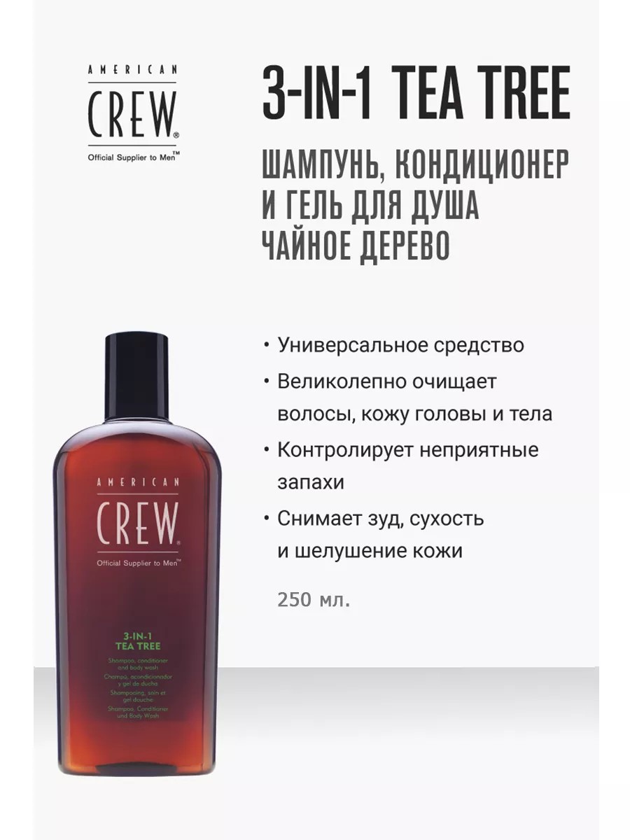 | Комплектация | American Crew Tea Tree 3 in 1 Шампунь для волос Кондиционер для волос и Гель для душа 250 мл - 1шт |