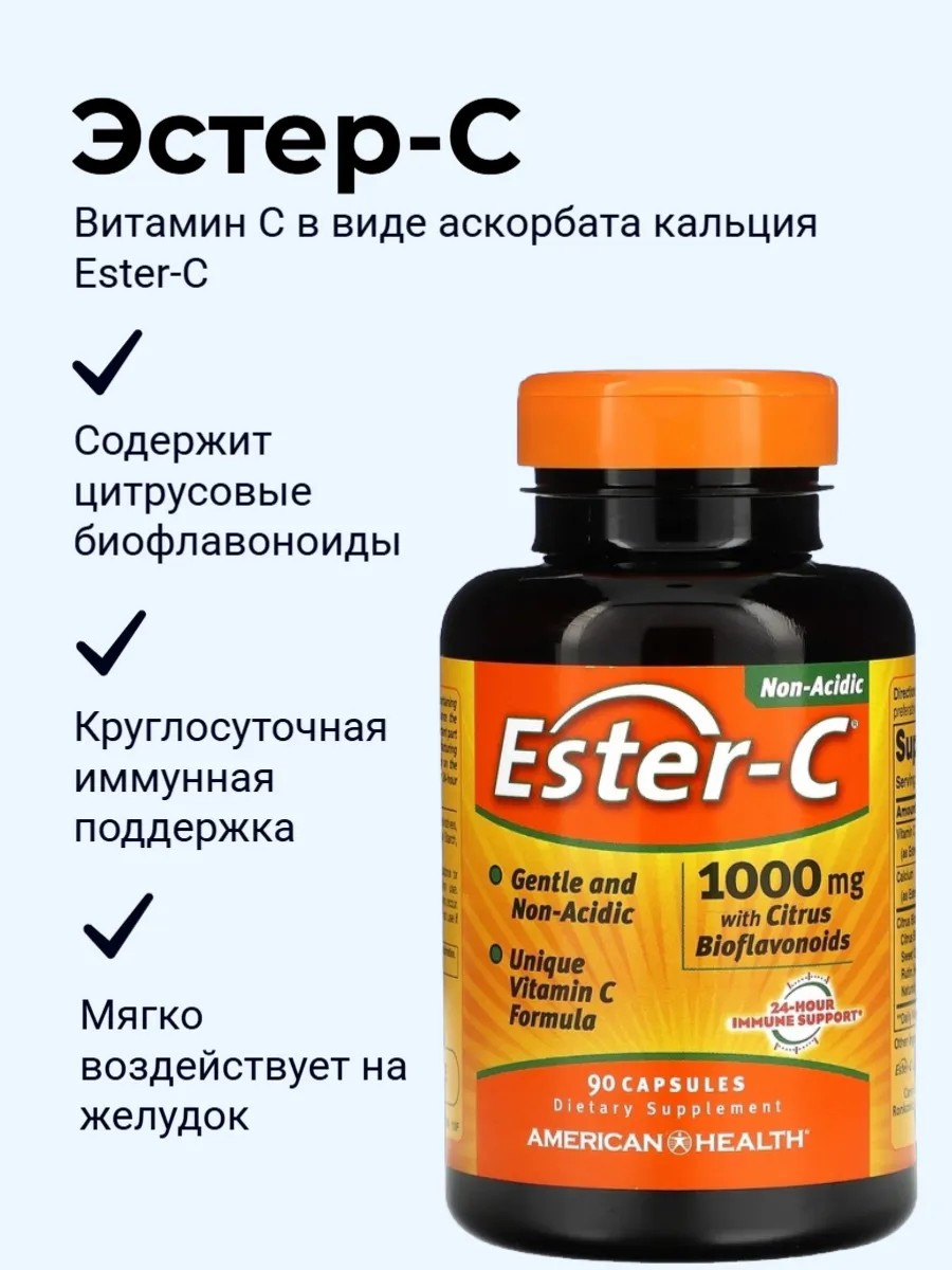 Эстер-C - это революционный запатентованный состав с витамином С, усиленный натуральными метаболитами. Метаболиты способствуют усвоению витамина С лейкоцитами. Эстер-C обладает нейтральным уровнем рН, что делает его некислотным и безопасным для желудка. Дневная доза продукции Эстер-C, содержащая 1000 мг, оказывает всестороннюю поддержку иммунной системы и осуществляет антиокидантную защиту, на которую вы можете положиться. Дополнительные биофлавоноиды цитрусовых помогают организму лучше переваривать и использовать витамин С.