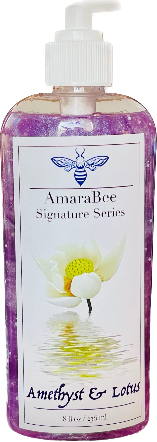 Amethyst and Lotus Body Wash is an indulgent blend of Wild Jasmine, Sweet Violet, Lotus Extract and Energetic Bergamot to excite the senses! A light, floral scent with bright notes of Citrus will start your day off bright and clean. Satisfy dry skin with this rich, creamy skin-softening body wash. A luxurious, gentle wash perfect for daily use and sensitive skin. Moisturizing Beads release oils on the skin and disintegrate, as they are made of eco-friendly and biodegradable cellulose and sugars specifically designed to deliver key ingredients when gently rubbed on the skin. Our body wash is made with clean ingredients while still delivering on the delightful experience that you expect out of a body wash: leaves your skin soft and lightly scented. Ingredients: Water, Sodium Laureth Sulfate, Cocamidopropyl Betaine, Xanthan Gum, Phenoxyethanol, Lotus Extract, Essenstial Oils. Beads: Mannitol, Cellulose, Hydroxypropyl, Methylcellulose, Jojoba Nut Oil, Titanium Dioxide