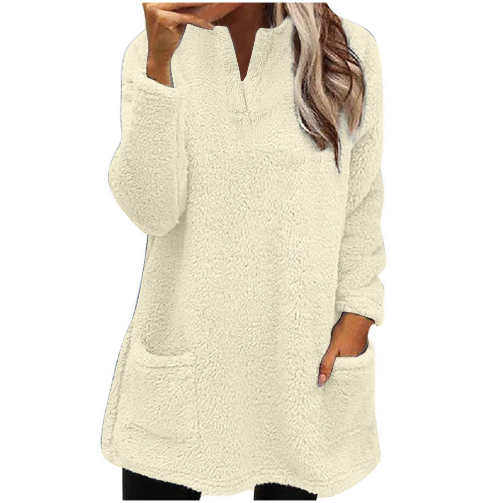 AMhomely Ladies Womens Soft Teddy Fleece Hooded Jumper Plus Size Double Fleece Casual Hoodies With Pocket V Neck Soft Fleece Hooded Sweatshirts Plain Pullover Tops Winter Lightweight Lounge Tops 04 Beige XXL