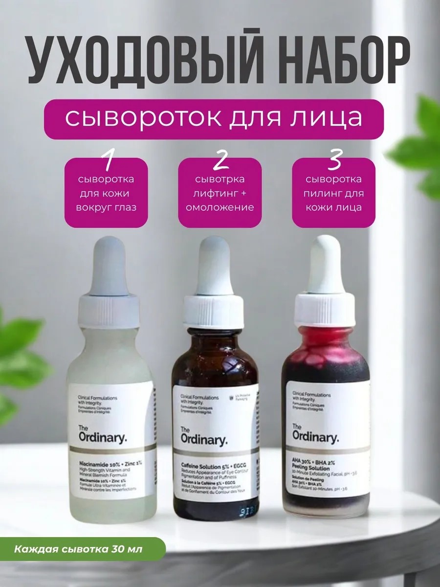 Набор сывороток 3в1 от THE ORDINARY VICO 3X30 MLКратко о товаре:• Сокращает морщины и уменьшает поры, замедляет процессы старения• Осветляет и выравнивает поверхность кожи при длительном применении• Увлажняющая которая притягивает и удерживает воду• Снимает отеки и темные круги под глазами1. Сыворотка пиллинг, АНА 30% + ВНА 2% - сыворотка пиллинг, стимулирует обновление клеток, устраняет тусклый цвет лица, эффективно чистит забитые поры, предотвращает появление прыщей и черных точек. Caffeine Solution2. 5%+EGCC - сыворотка для ухода за кожей вокруг глаз, содержит высокую дозу кофеина и галлат эпигаллокатехина, полученной из листьев зеленого чая.Снимает отеки и темные круги под глазами, замедляет процессы старения.3. Сыворотка Niacinamide 10%+Zinc 1% cниацинамидом 10% и цинком 1%, предназначена для устранения кожных высыпаний и уменьшения выделения кожного жира, снижает уровень жирности кожи, избавляет от высыпаний и пигментации, помогает скрывать шрамы, обеспечивает омолаживающий эффект. Кожа становится чистой и ухоженной.