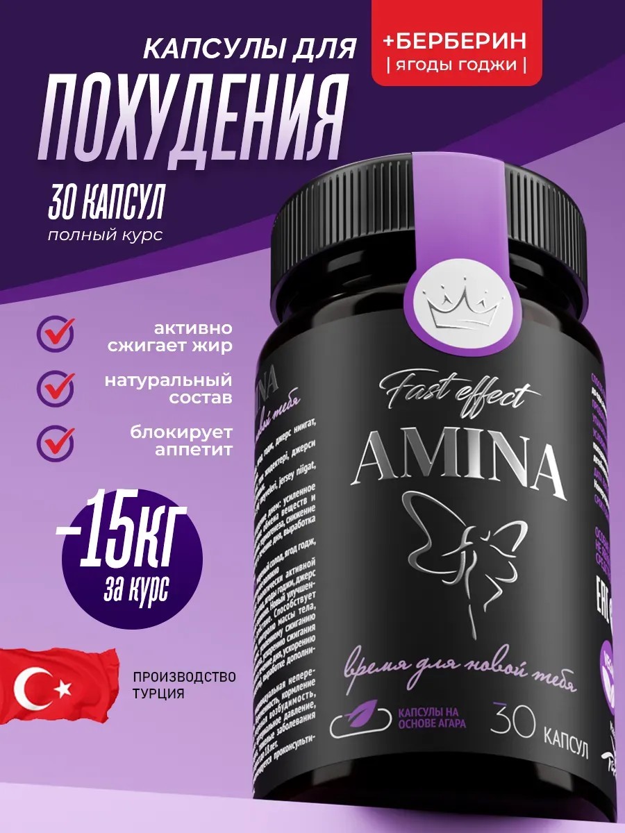 Капсулы Amina для похудения - активно жсигает жир, имеет натуральный состав, блокирует аппетит. Содержит берберин и ягоды годжи. Берберин ускоряет метаболизм, способствует похудению, помогает организму эффективнее перерабатывать углеводы и жиры.